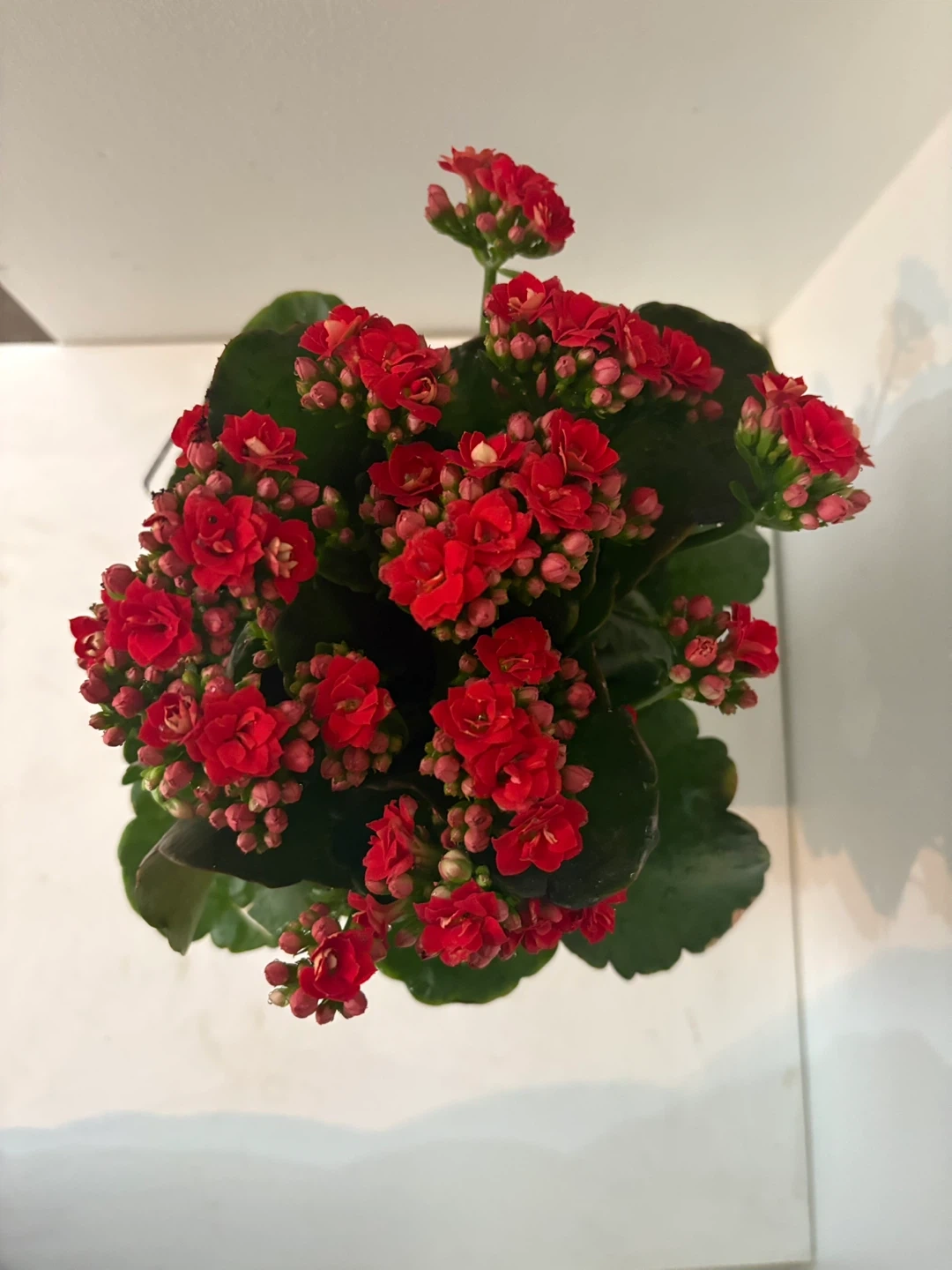 Bright red kalanchoe plant blooming in a clear, decorative glass pot. It's a lovely splash of colour for any indoor space. This plant thrives in bright light and is easy to care for.