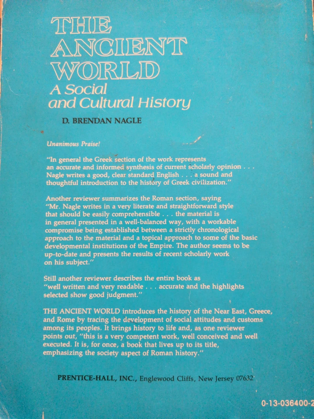 This is "The Ancient World: A Social and Cultural History" by D. Brendan Nagle. It covers the history of the Near East, Greece, and Rome, tracing social and cultural developments. This book is well-written and offers a comprehensive overview of ancient civilizations.