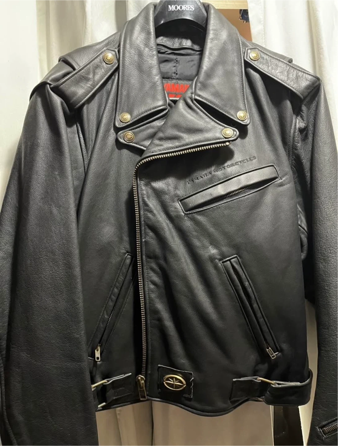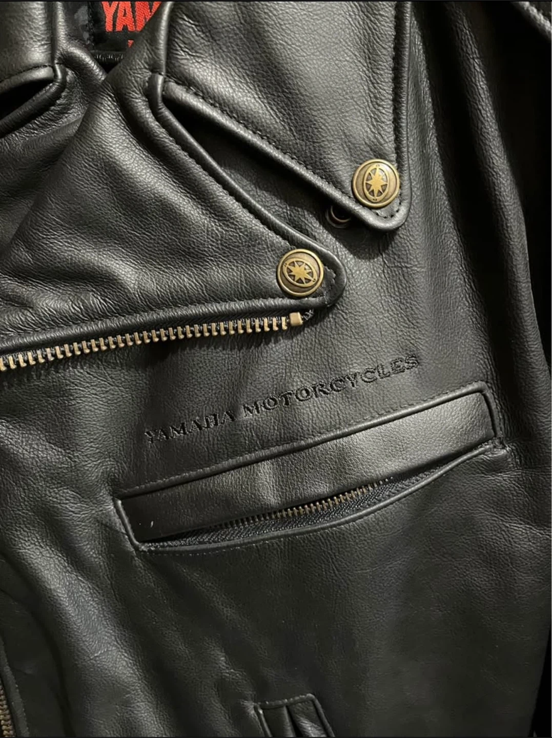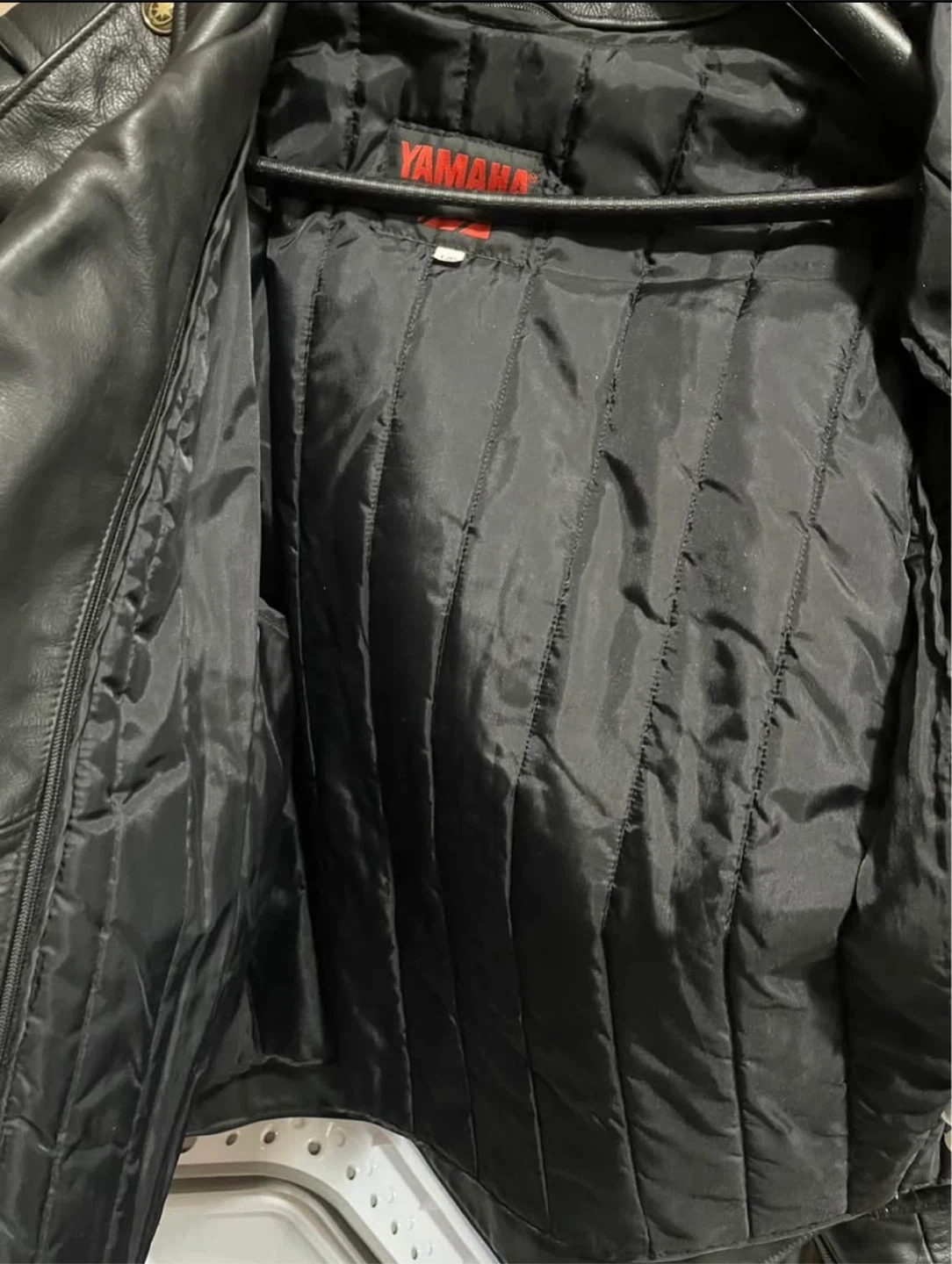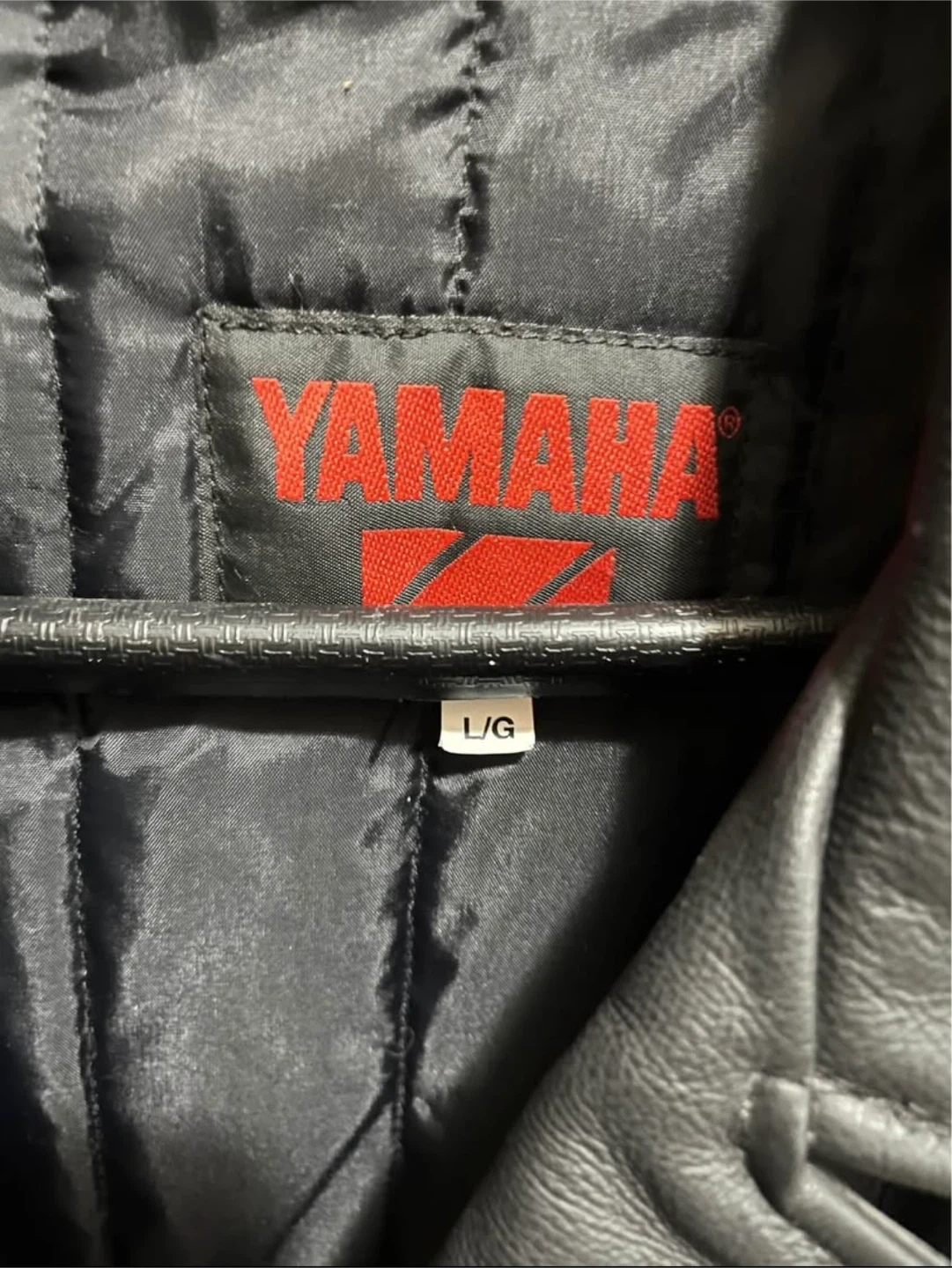 Black Yamaha Motorcycles leather jacket. Size L/G . Features quilted lining for added warmth and comfort, embroided Yamaha logo on the back.
