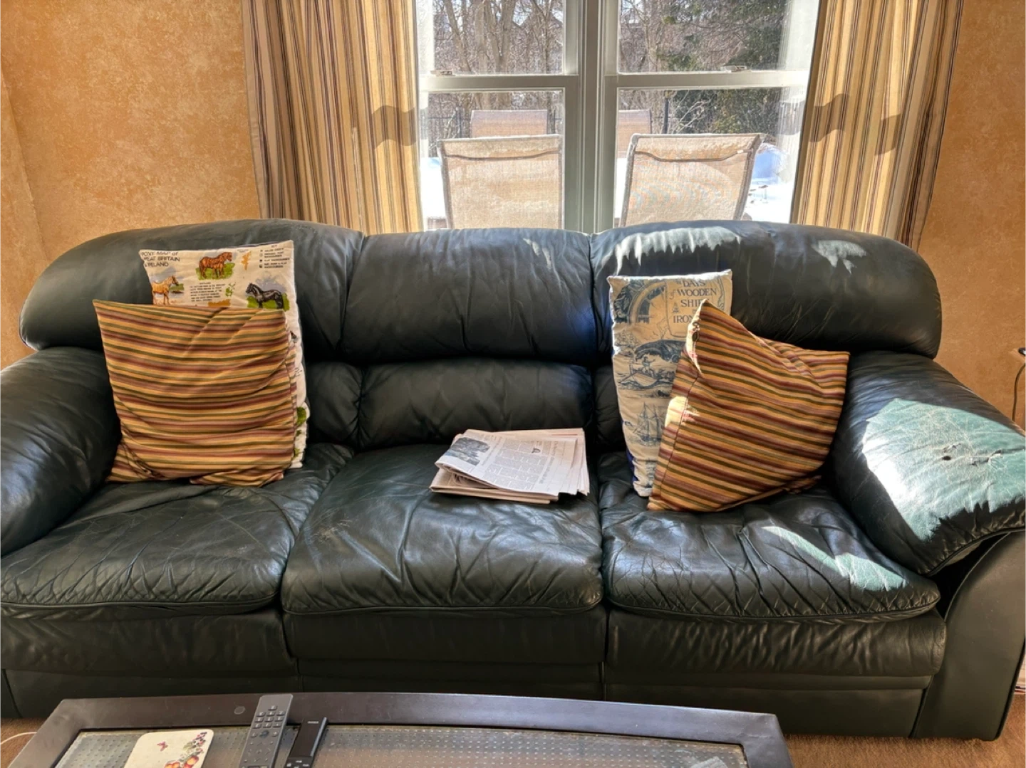 Three-seater sofa upholstered in dark green leather. It's a comfortable seating option for any living space. The leather shows some signs of wear. The cushions include decorative pillow covers.