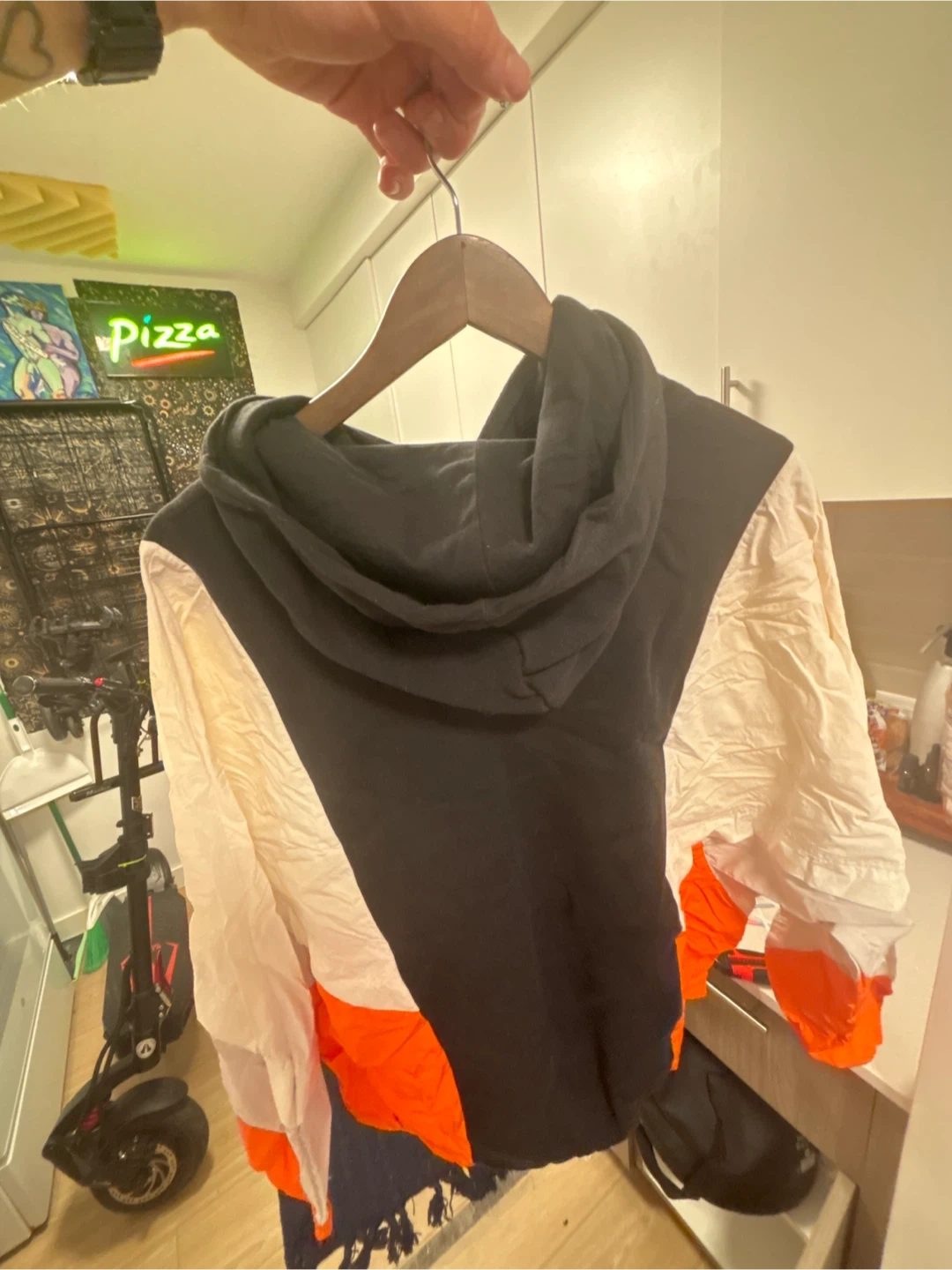 Selling a Nike color block windbreaker hoodie. It features a black hood, white sleeves, and orange bottom. The hoodie has a drawstring and the Nike logo on the chest.
