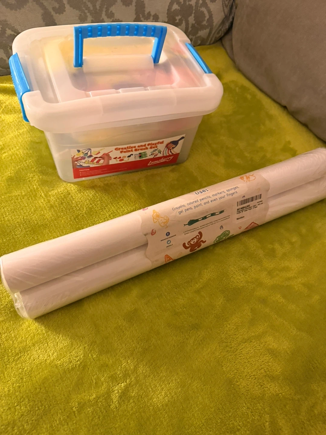 This set includes a carrying case, painting smock, paper roll, and various art supplies. It's designed for creative and playful art experiences. Use it with crayons, coloured pencils, markers, sponges, gel pens, paint, and even your fingers!