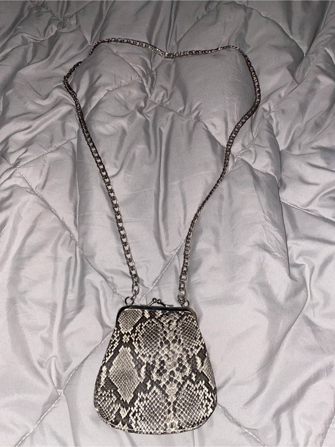 This is a coin purse with a snake print design. It features a silver-tone chain strap and a clasp closure. Material appears to be faux leather.