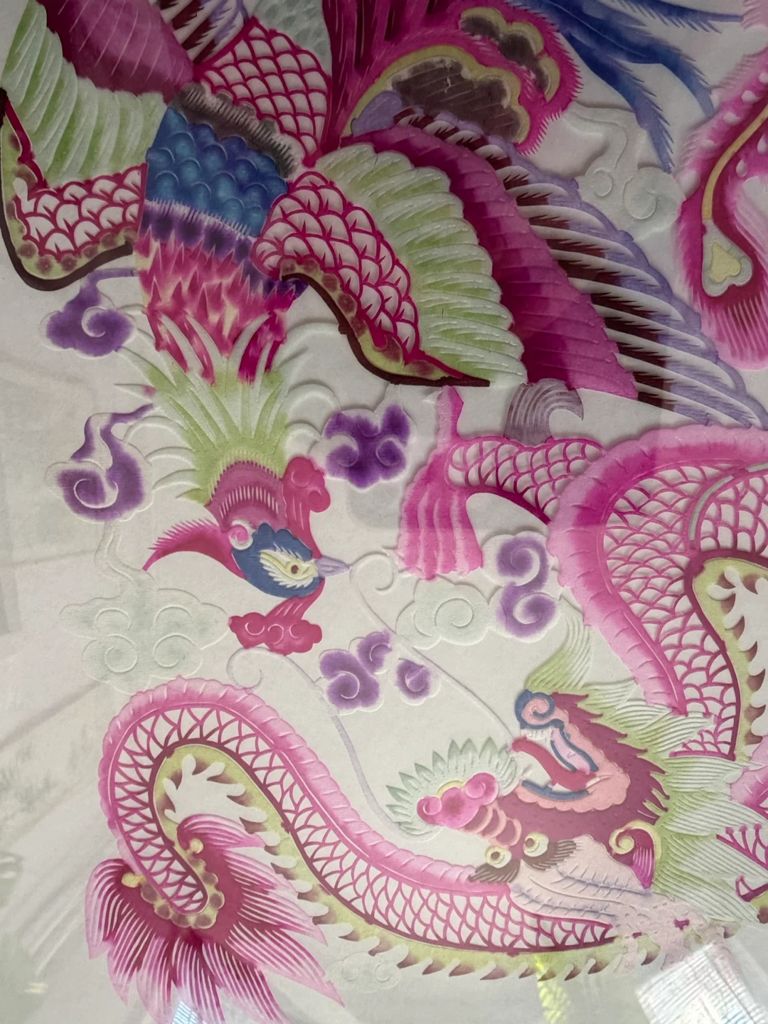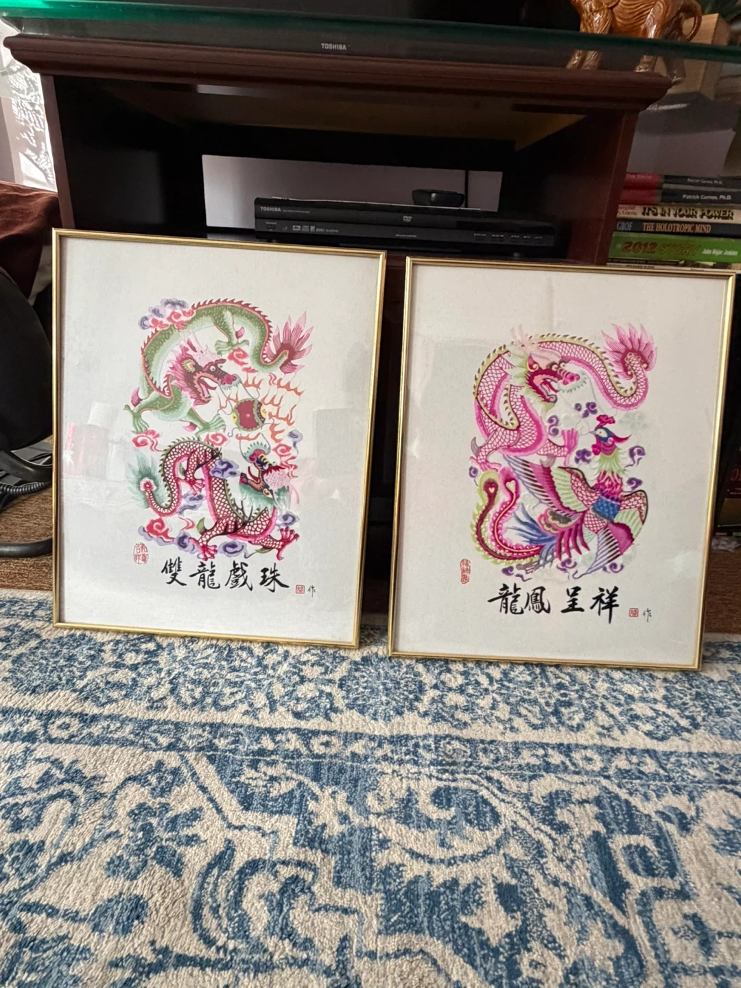 This set includes two framed Chinese paper cutouts, one with dragons and another with a dragon and phoenix design. The vibrant colors and intricate details make them a striking addition to any decor. They're perfect for adding a touch of cultural art to your home!