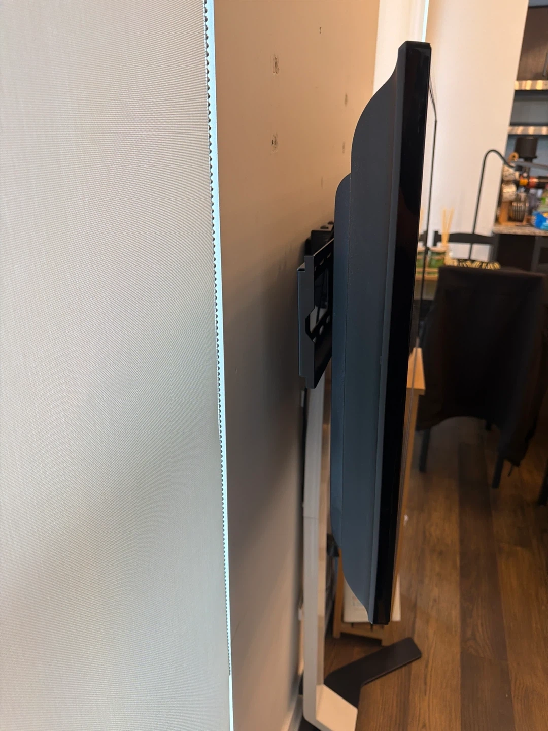 This is a Samsung smart TV, it's mounted on a stand and comes with its original remote. It's in good working condition.