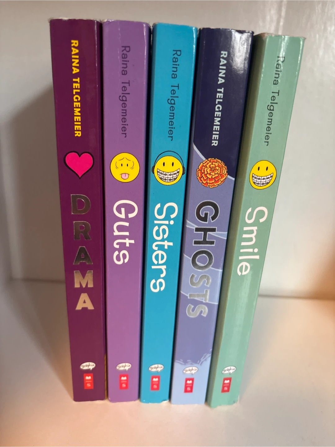 Set of five Raina Telgemeier graphic novels: Drama, Guts, Sisters, Ghosts, and Smile. These books are great for young readers exploring relatable themes. All books are softcover.