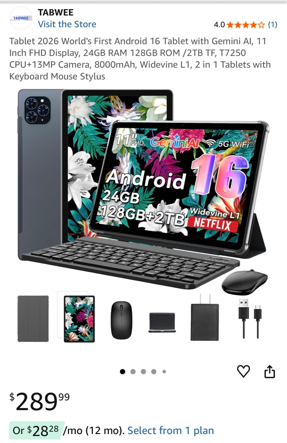 This TABWEE tablet boasts a 11-inch FHD display and Android 16. It's equipped with 24GB RAM and 128GB ROM, expandable to 2TB. The package includes a keyboard, mouse, and stylus. This device is good for productivity and entertainment on the go!