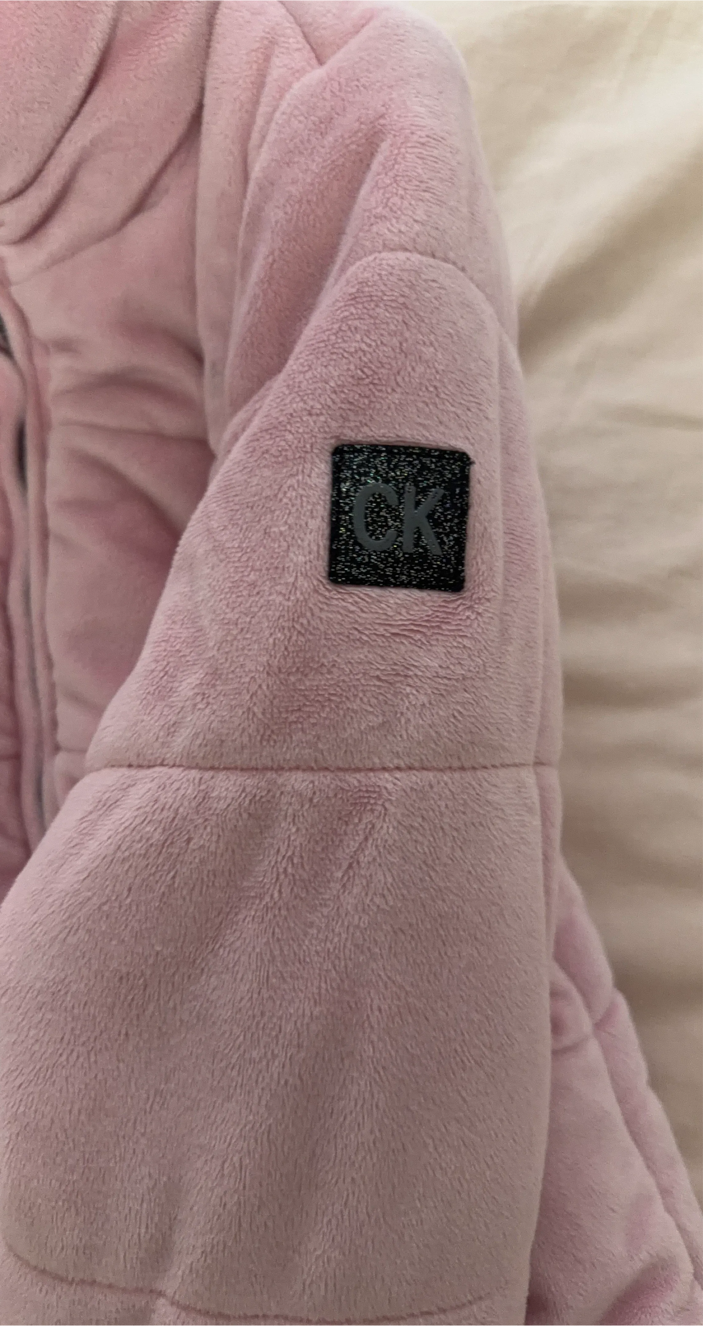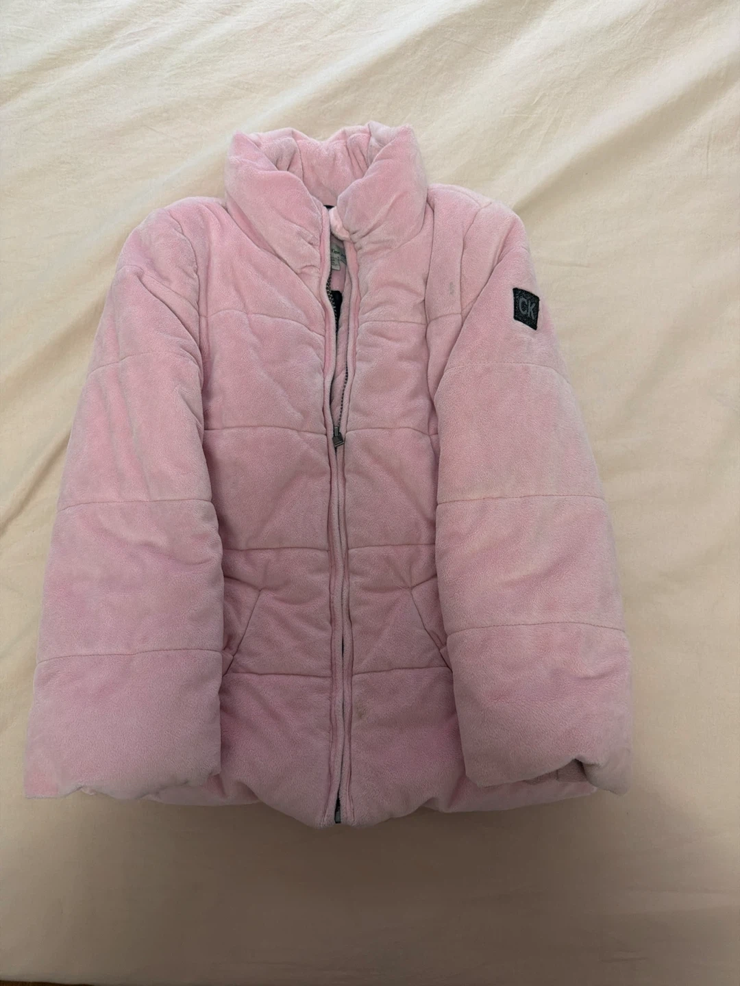 Calvin Klein pink velour puffer jacket. It's a comfy and stylish puffer coat. Features a high collar and zippered closure. Great for cooler weather!