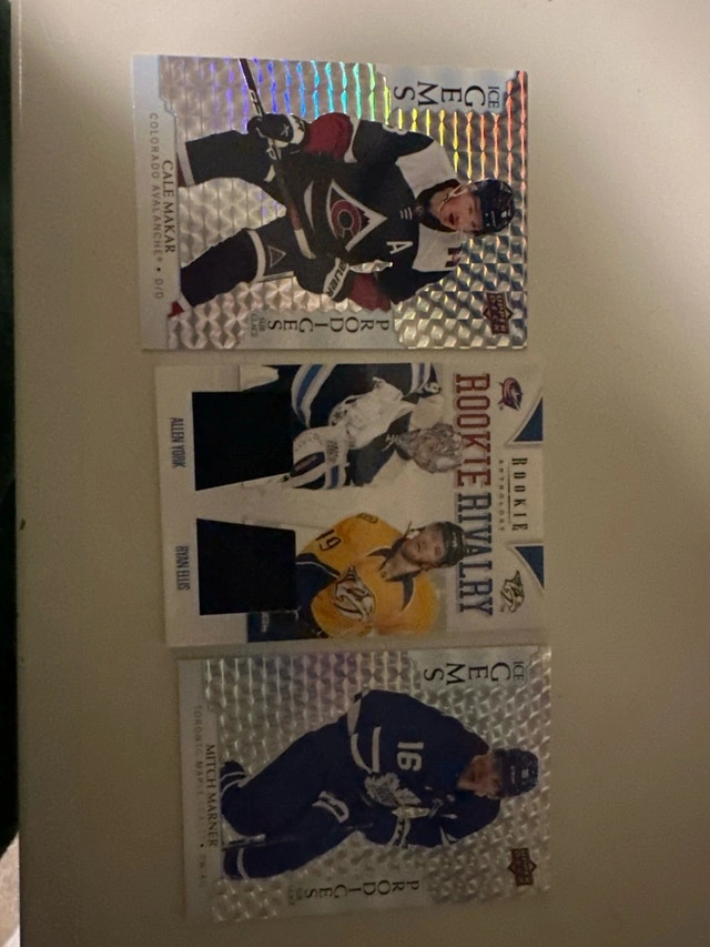 Selling 2 Upper Deck ICE GEMS cards (Cale Makar and Mitch Marner), plus one Rookie Rivalry panini card. Pick up or meet up.