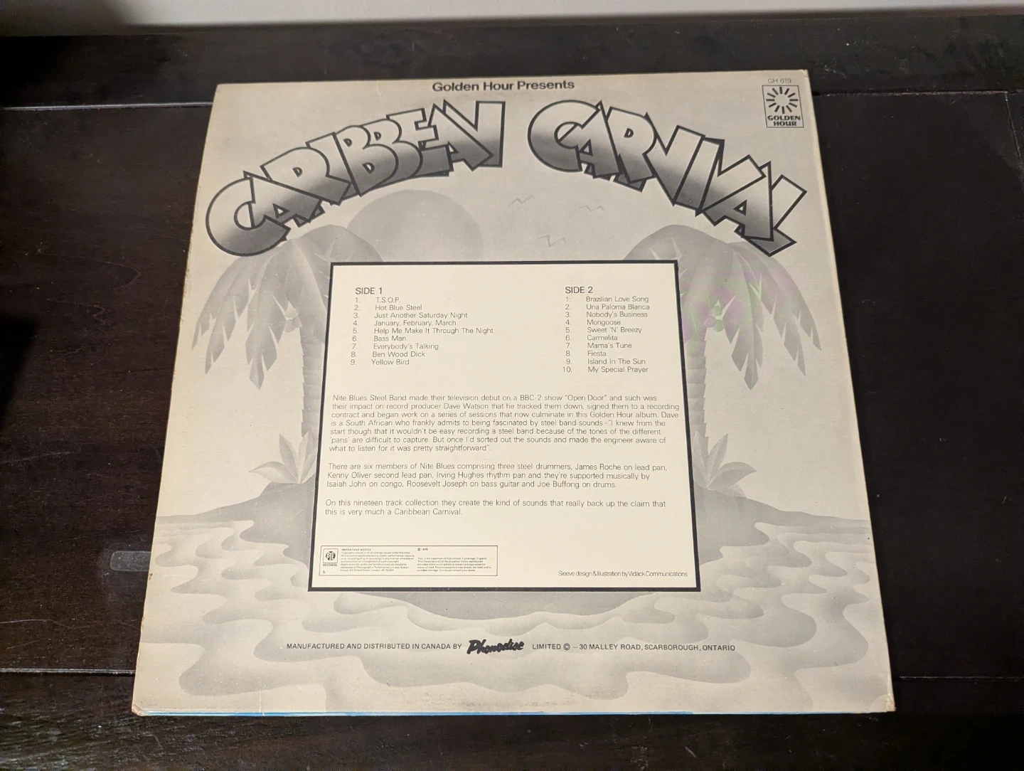 This vinyl record features the Nite Blues Steel Band playing on the "Caribbean Carnival" album. It includes 20 tracks across two sides, offering a collection of sounds. Manufactured and distributed in Canada. Cover has some wear, vinyl looks great. Tested and plays fine. Smoke free home. Pick in Westney Heights area