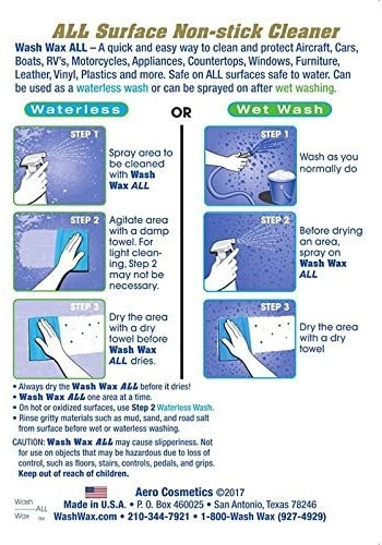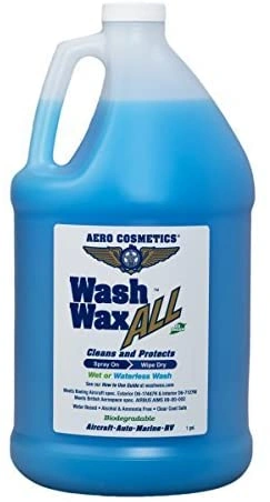 New, 1 Gallon jug of Aero Cosmetics Wash Wax ALL. This is a biodegradable waterless wash and wax in one. Clean & protect your entire vehicle without water. Developed over 30 years ago for aircrafts, it also works great on RVs, boats, and motorcycles. It removes dirt without scratching. Simply spray on and wipe dry. Leaves an anti-static, non-stick UV protective coating on all surfaces like paint, glass, plastic, leather, vinyl, rubber, wood, gel coat, aluminum, granite, and other hard surfaces. More than one jug available.