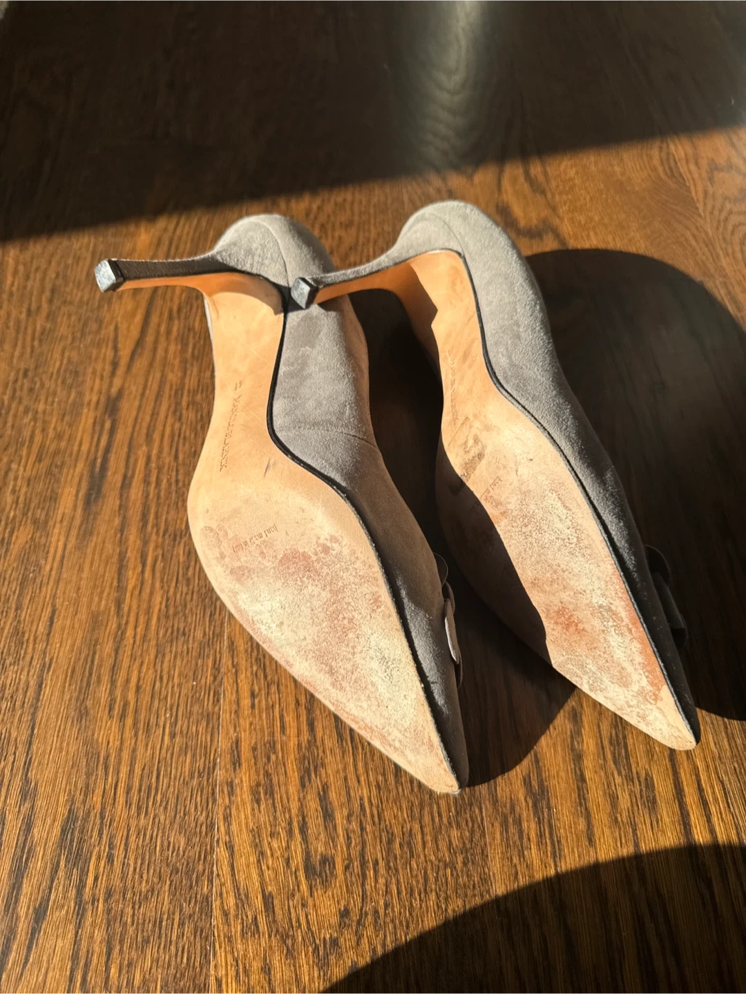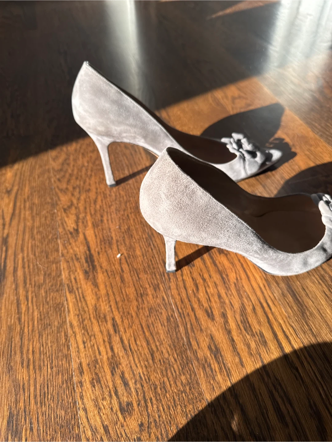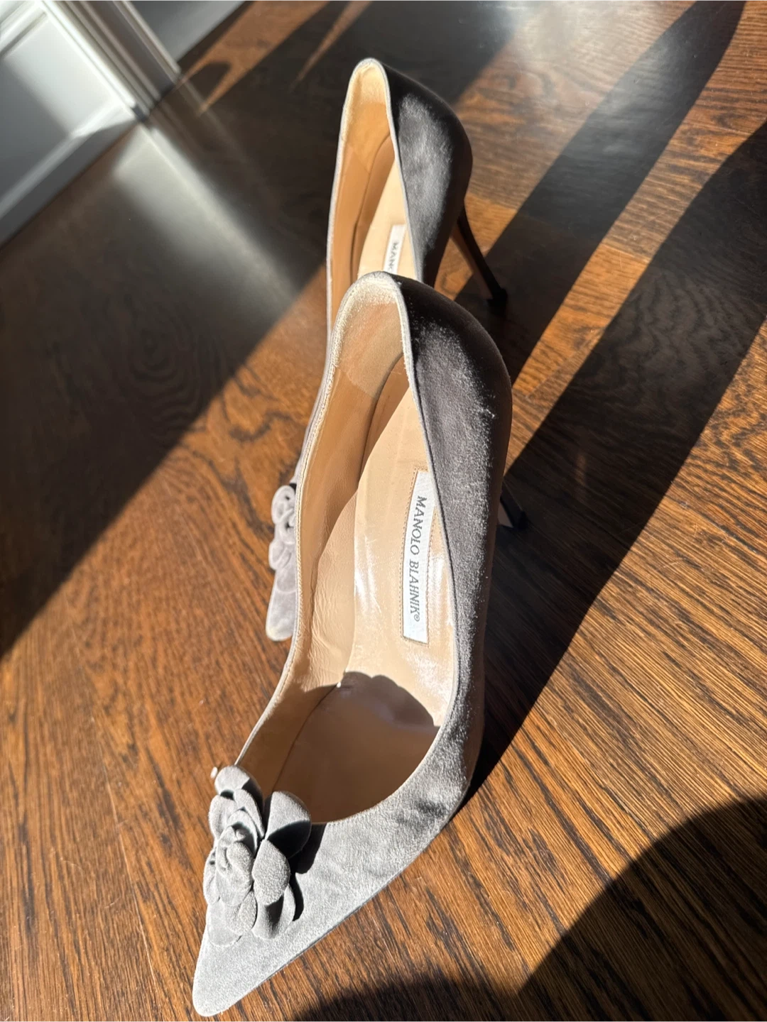Elegant Manolo Blahnik grey suede heels featuring a delicate flower embellishment. The uppers are suede, and they have a pointed toe with a stiletto heel. Perfect for dressing up an outfit! No longer a heels lady but man these were fun the couple of times they were worn. Size 41