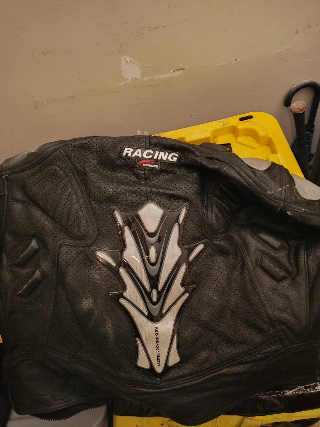 Black leather motorcycle jacket with racing design. Perforated panels for ventilation. Features full zip closure.
