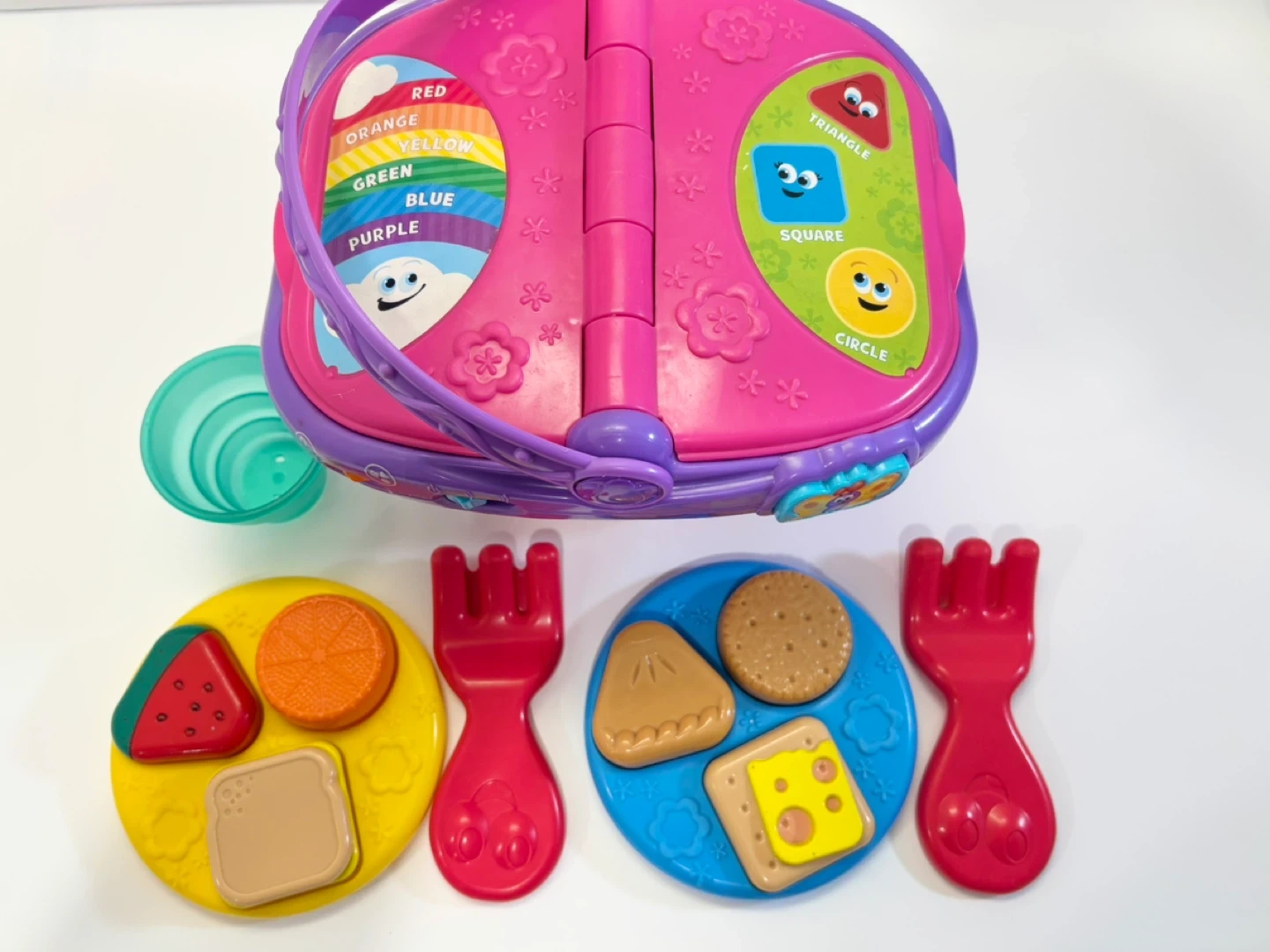 LeapFrog Shapes & Sharing Picnic Basket with interactive food and shape sorting. Includes plates, forks, cups, and food pieces like watermelon, sandwich, cookies, and cheese. Teaches colours, shapes, and sharing.