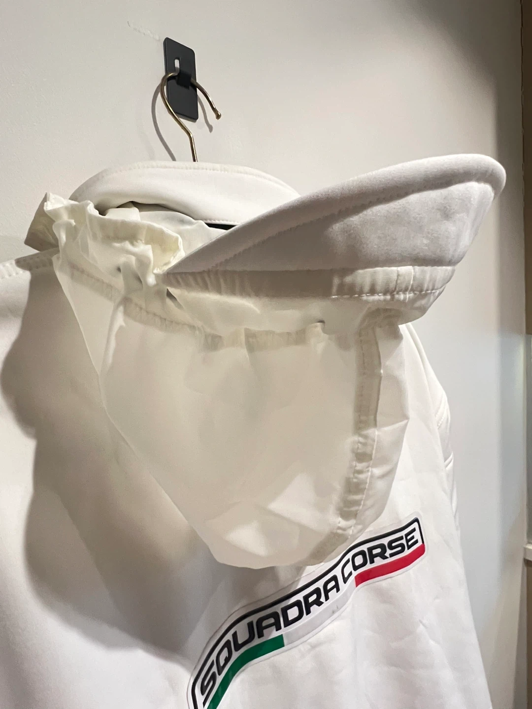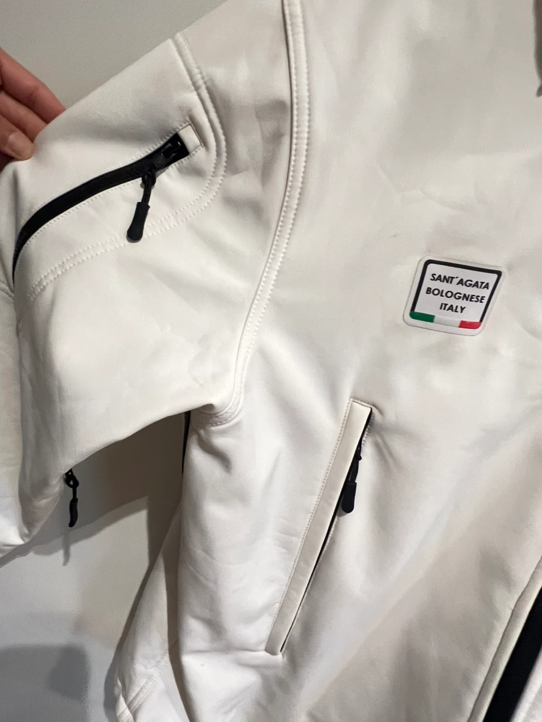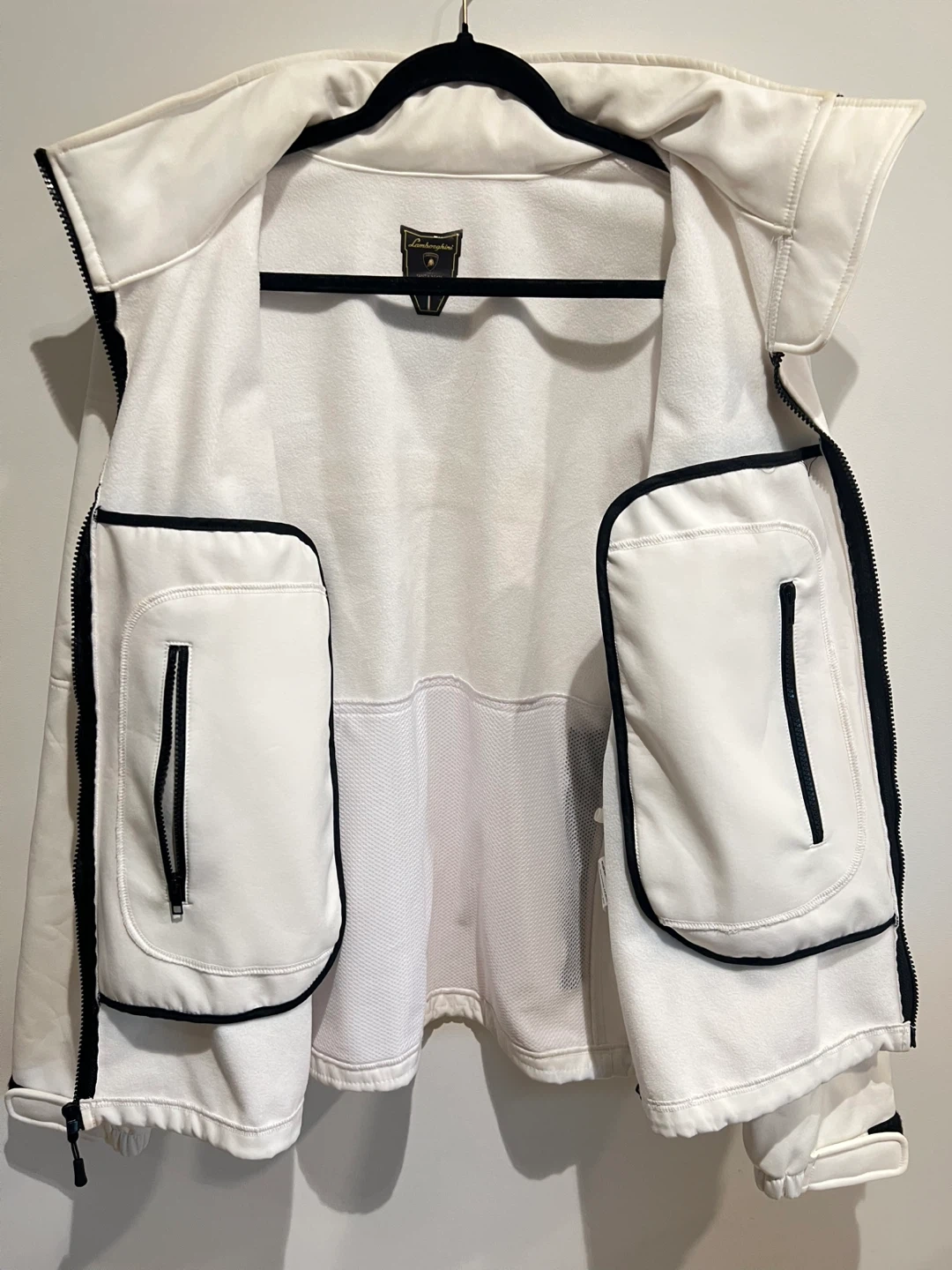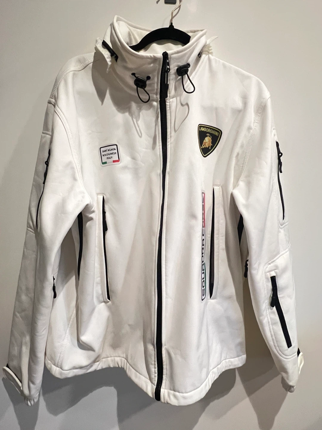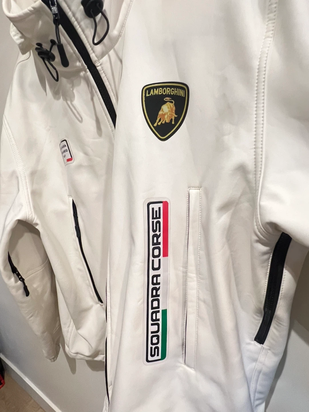 Lamborghini Squadra Corse jacket from Sant'Agata Bolognese, Italy. (Replica) It features multiple zippered pockets and a full-zip front. This jacket is white with black accents.
