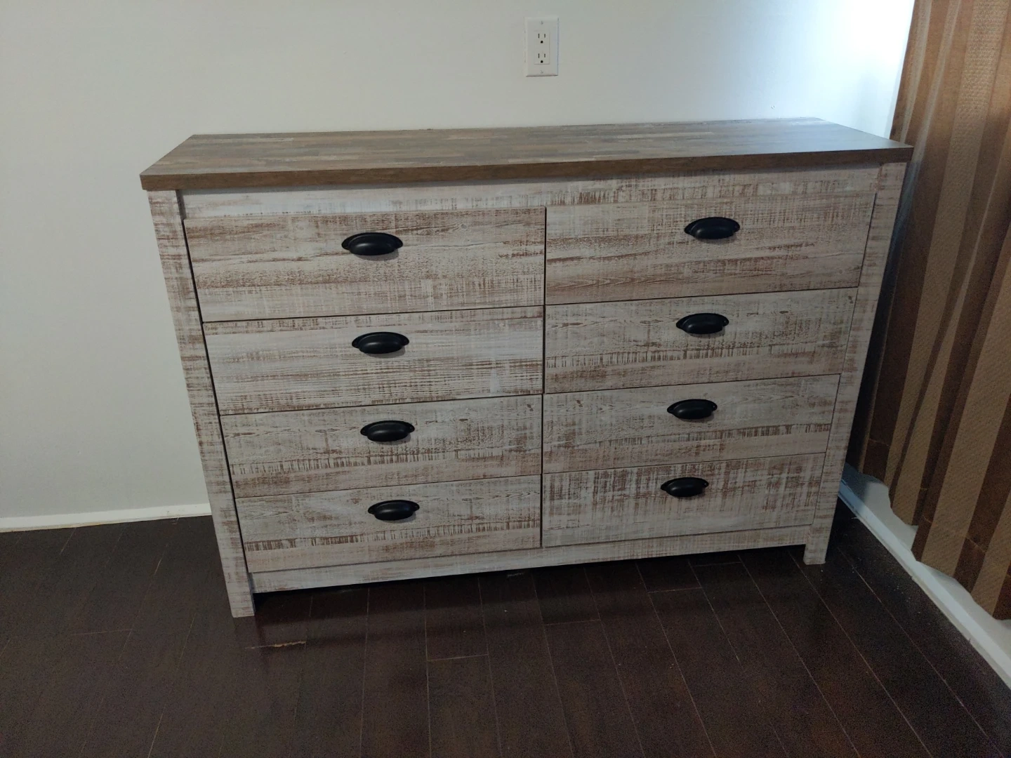 This dresser features a distressed whitewashed wood finish with black bin-style pulls. It has a total of six drawers, with three drawers on each side. The top surface has a contrasting wood grain. It's great for storing clothes or linens.