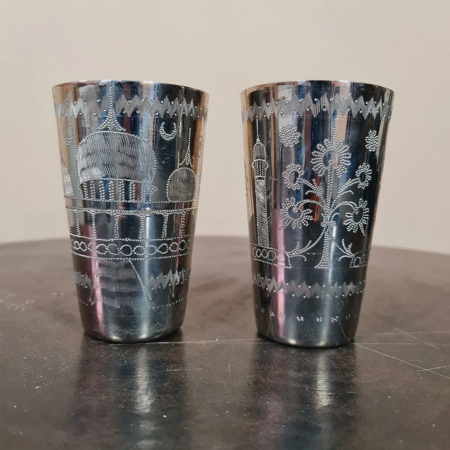 Selling a set of two etched silver drinking glasses. They have a unique architectural design etched into them! These are great for adding a touch of elegance to your home. A perfect Birthday or Ramadan gift - feel free to stop by in-person to see this piece!