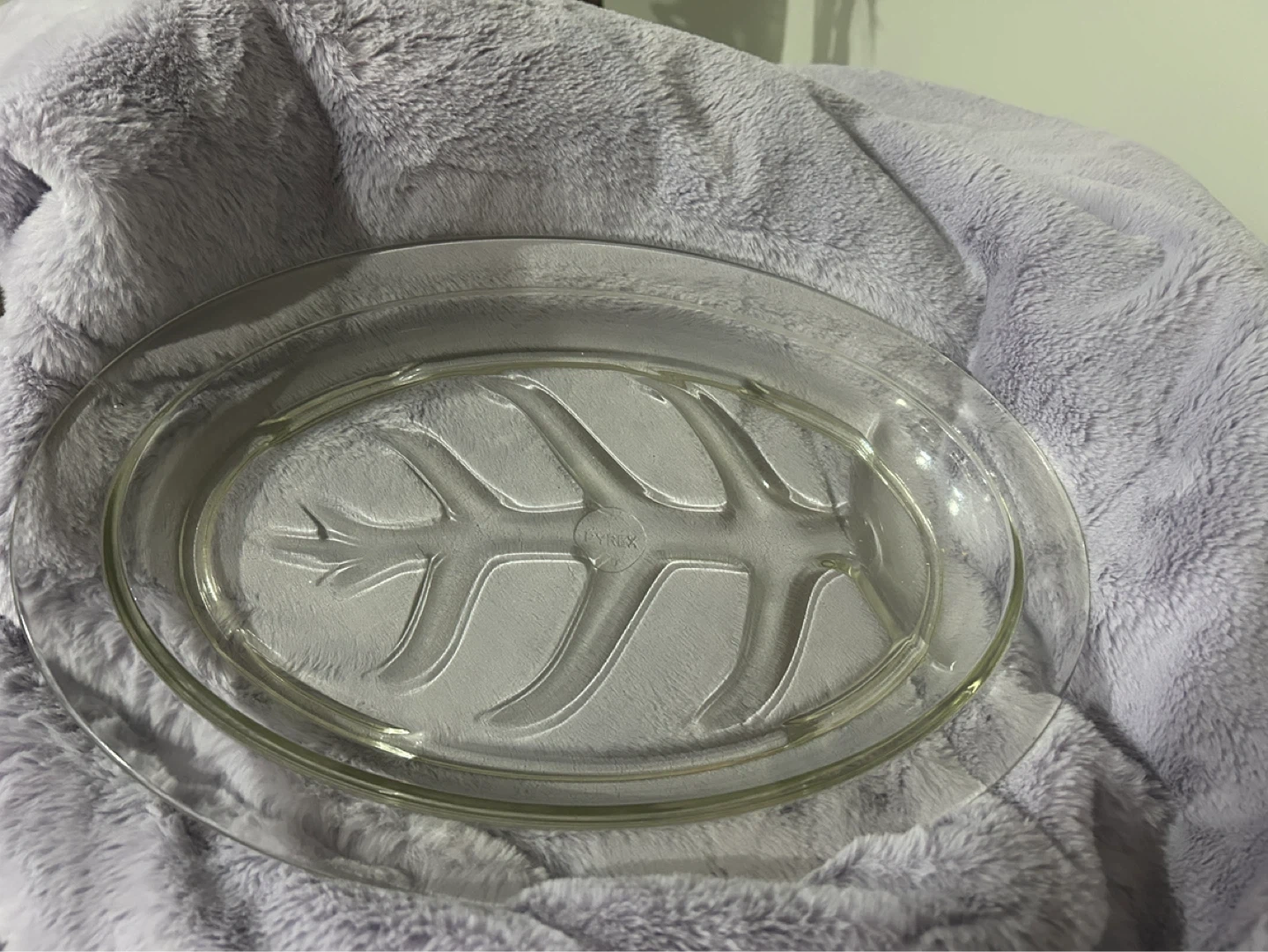 Clear glass oval roasting pan with handles. It has a textured design on the bottom. Dishwasher safe.