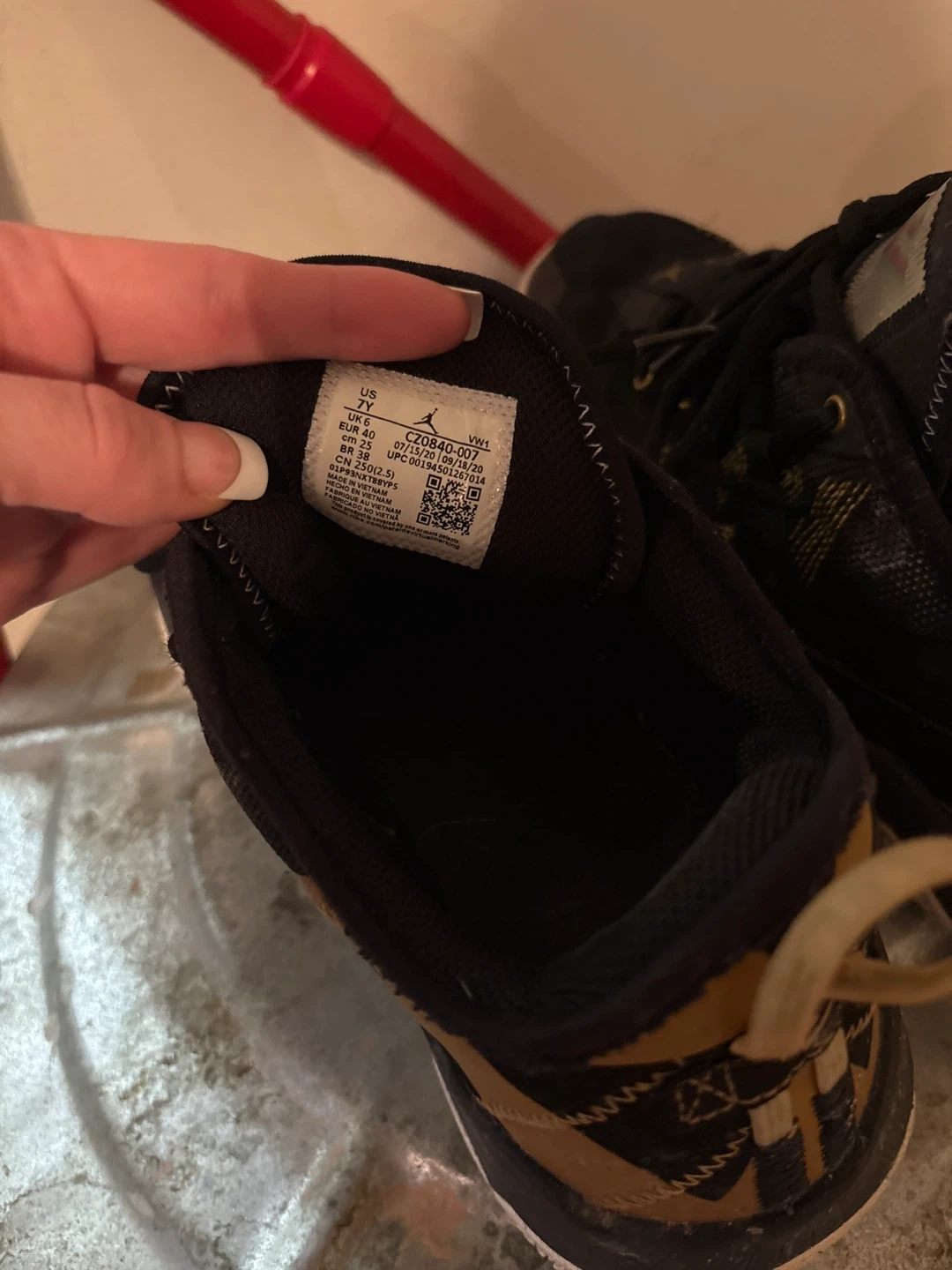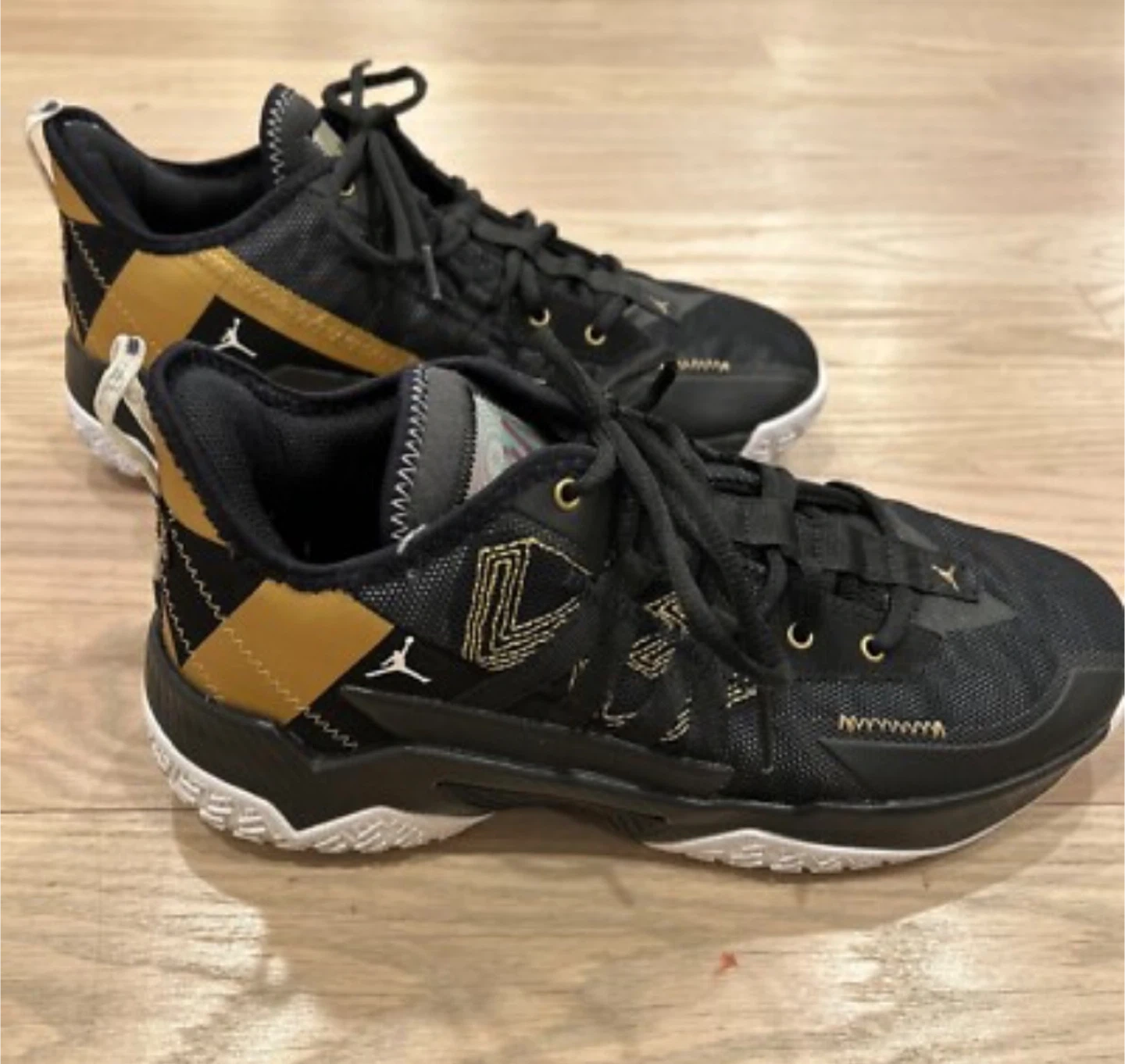 Jordan XXXVII Low basketball shoes in black and gold. US size 7Y. These shoes feature a lightweight and breathable design for performance on the court. The rubber outsole provides excellent traction. Perfect for young athletes looking for style and function!