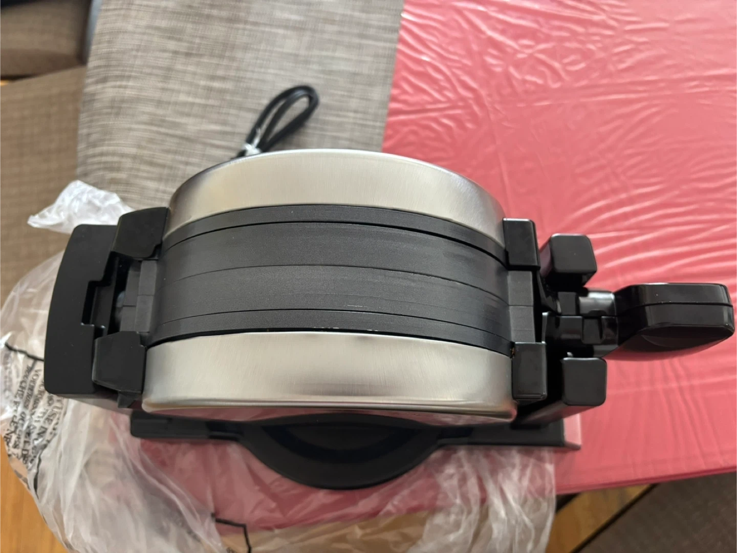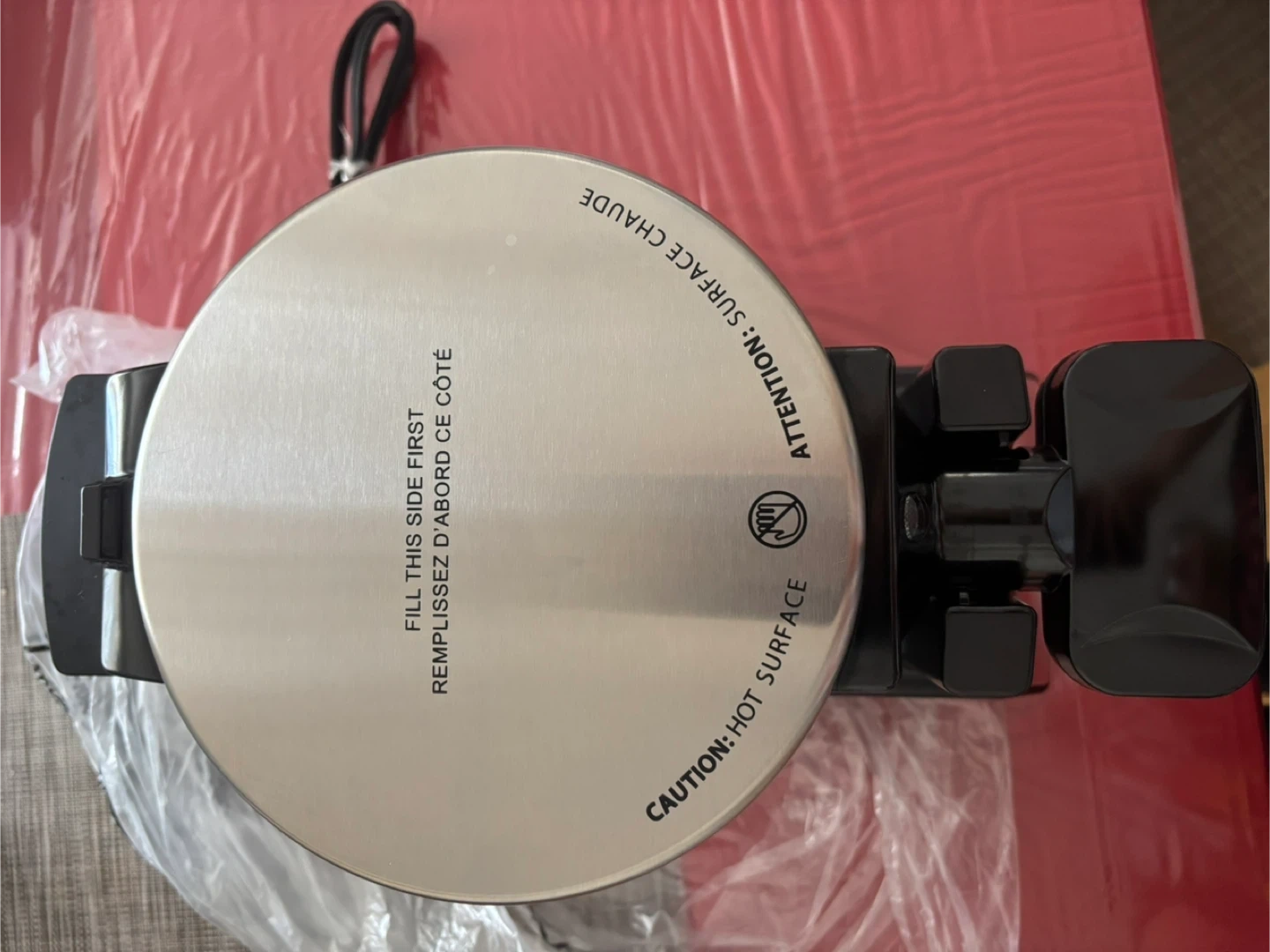 This is a Salton Belgian waffle maker. It features a non-stick coating for easy cleanup. The rotating design makes for even cooking.