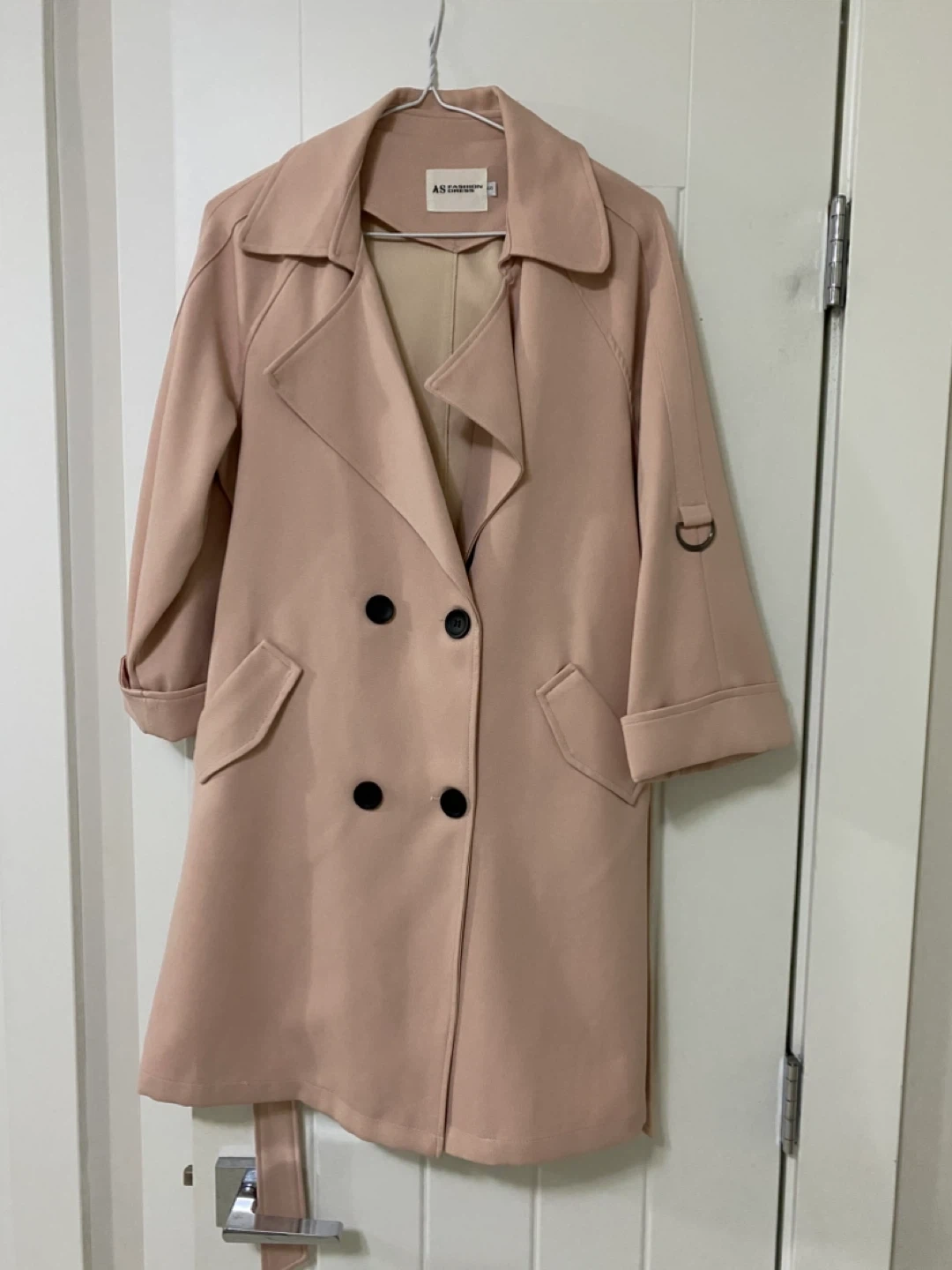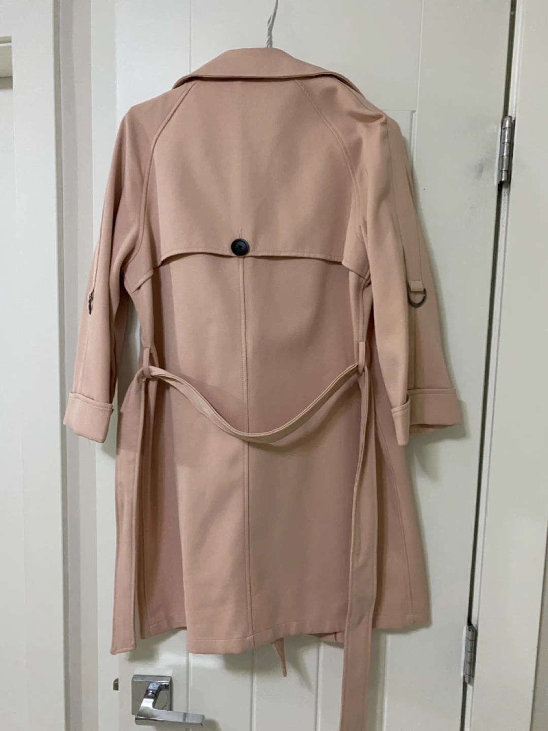 This trench coat is a lovely pale pink colour. It's a double-breasted style with a matching belt. The coat has a classic trench coat design with a back storm flap and decorative cuff straps.