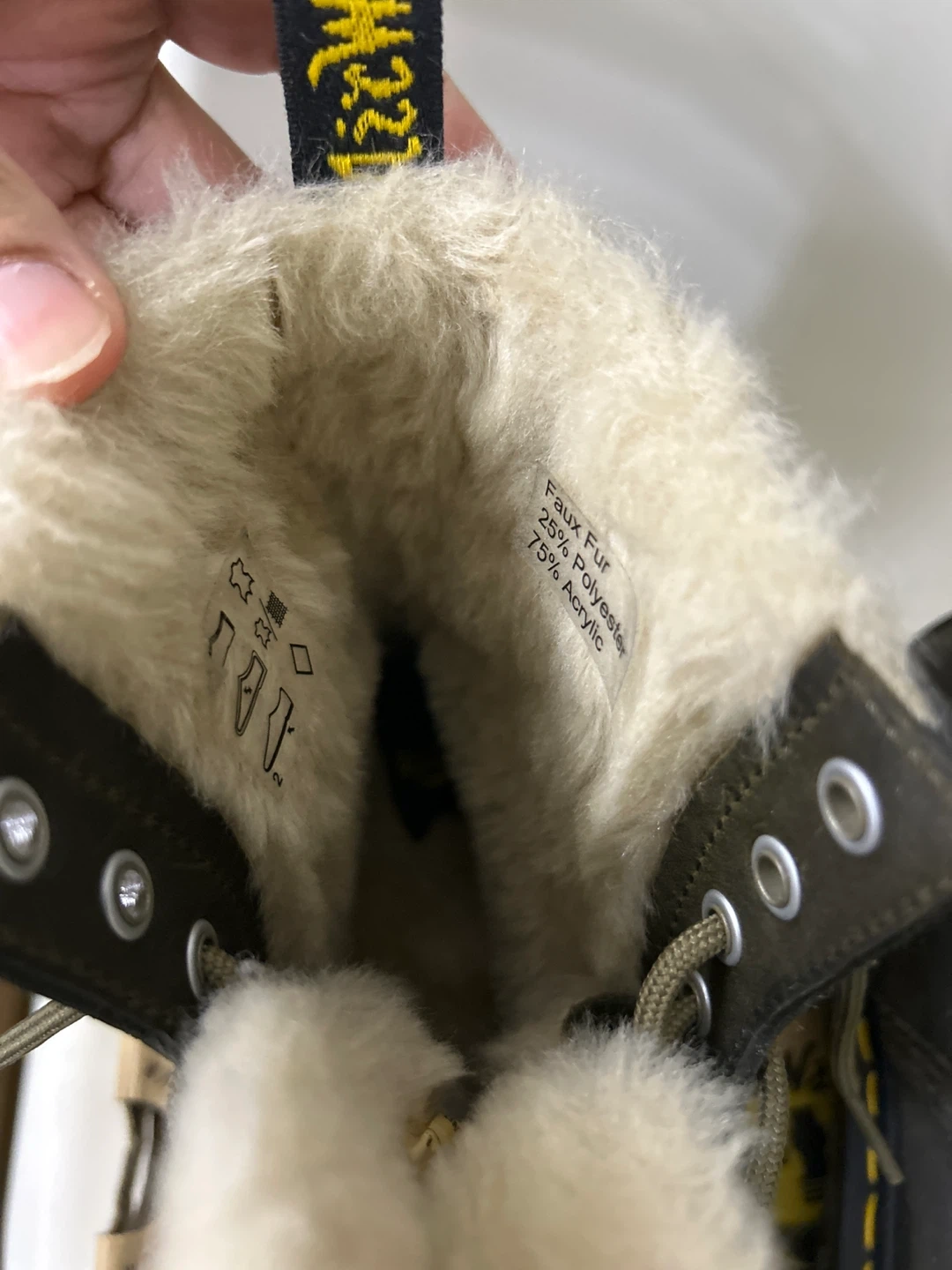 Dr. Martens boots featuring a warm faux fur lining. The lining is made of 25% Polyester and 75% Acrylic. These boots are great for colder weather!