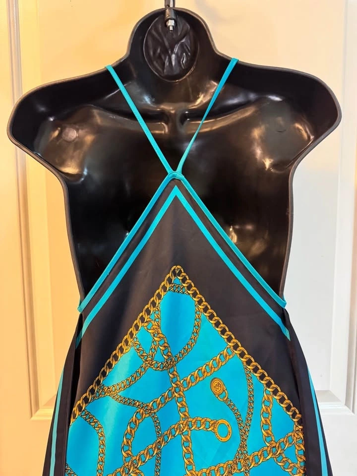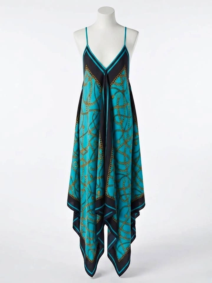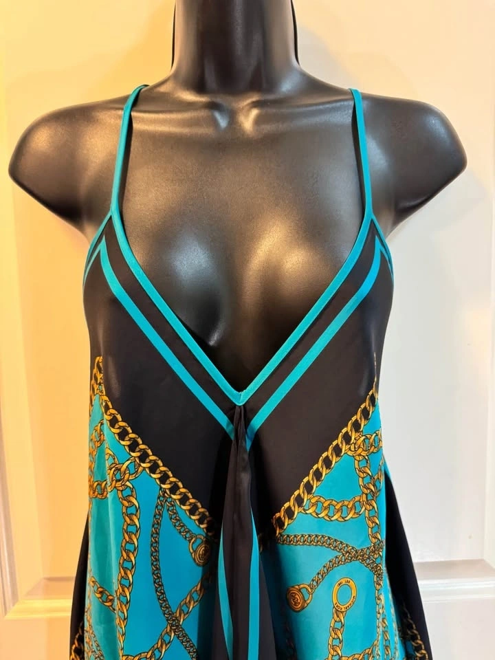 Lightweight turquoise dress with a gold chain-print overlay. Slim V-neck and thin spaghetti straps. Handkerchief hem creates fluid movement. Elegant contrast trim and paneling.