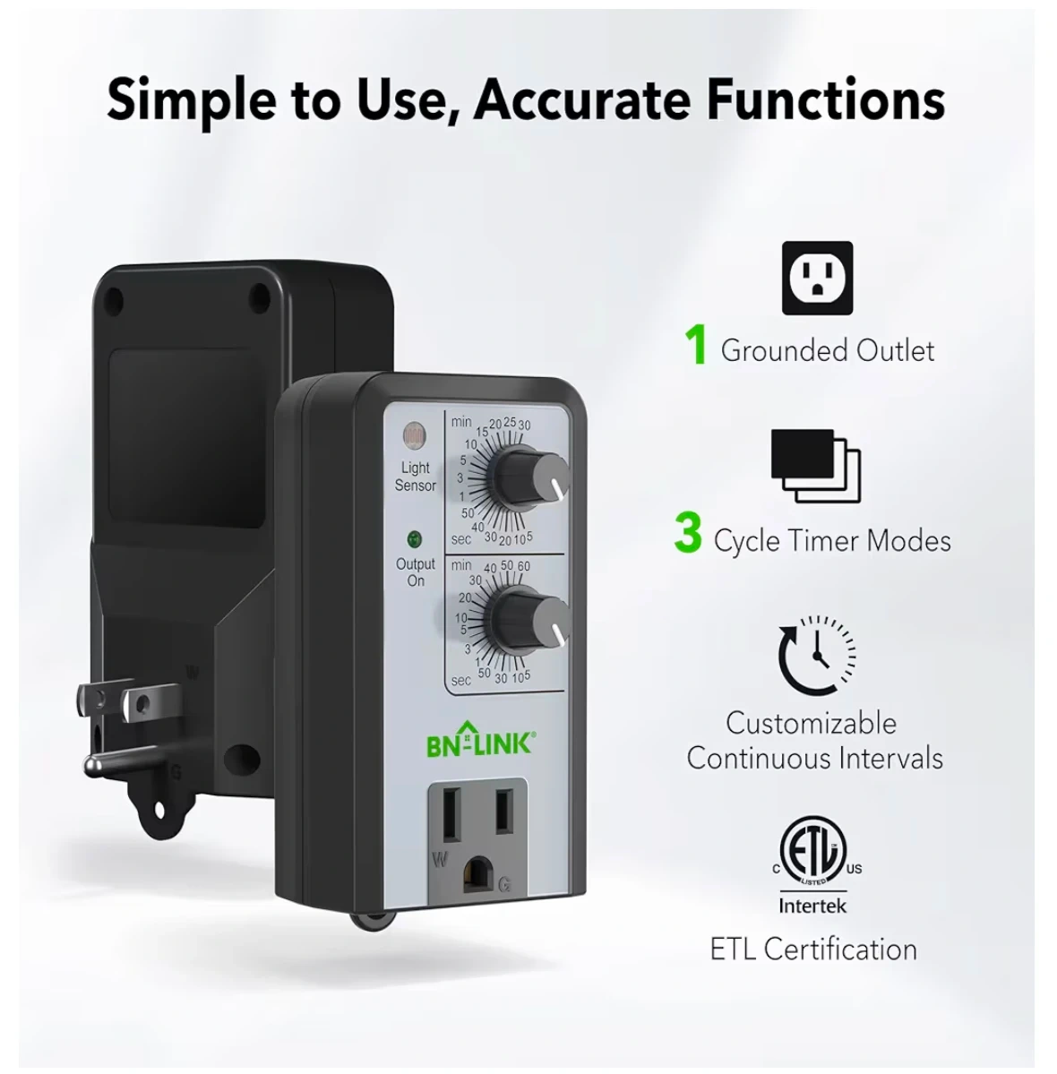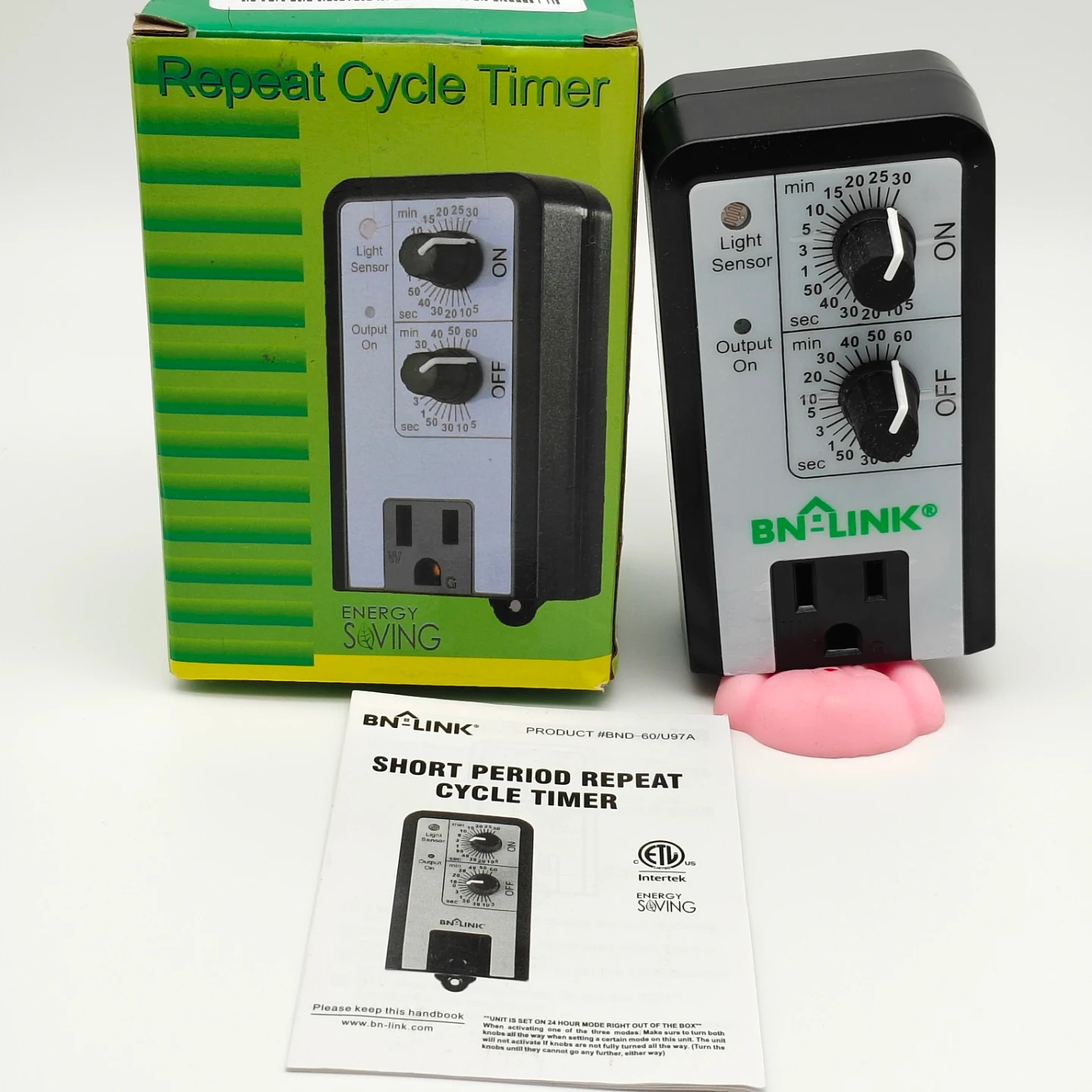 This is a BN-LINK short period repeat cycle timer. It's designed for energy saving applications. The timer allows for customizable ON and OFF intervals, ranging from 5 seconds to 60 minutes. It also features a light sensor for added functionality.