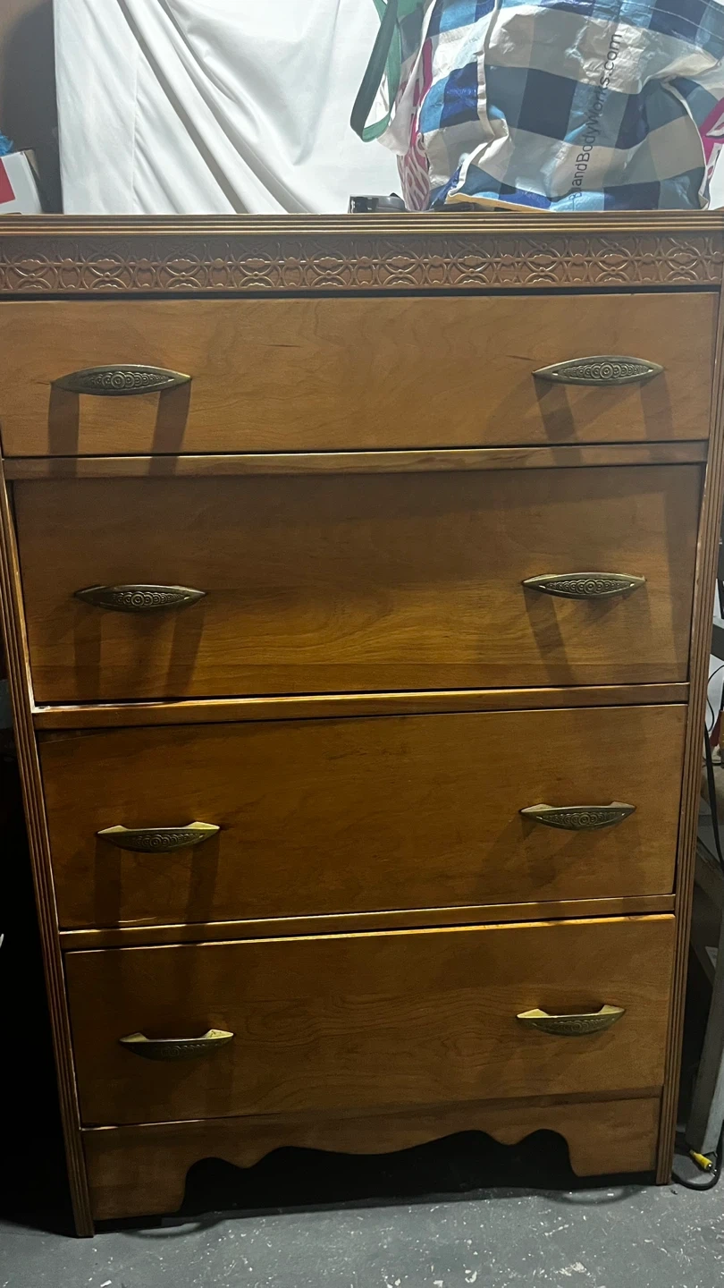 This is a vintage wooden dresser with four drawers. It features ornate metal drawer pulls and decorative carving along the top edge. The wood has a warm, honey-toned finish. It’s quite heavy!