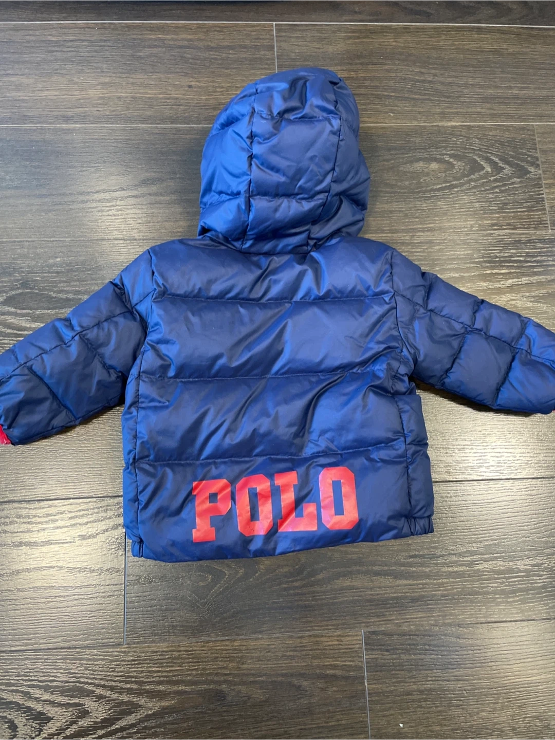 Navy blue puffer jacket by Ralph Lauren. Bought new, only worn a few times before baby outgrew it. Size 9mo, fits generously.