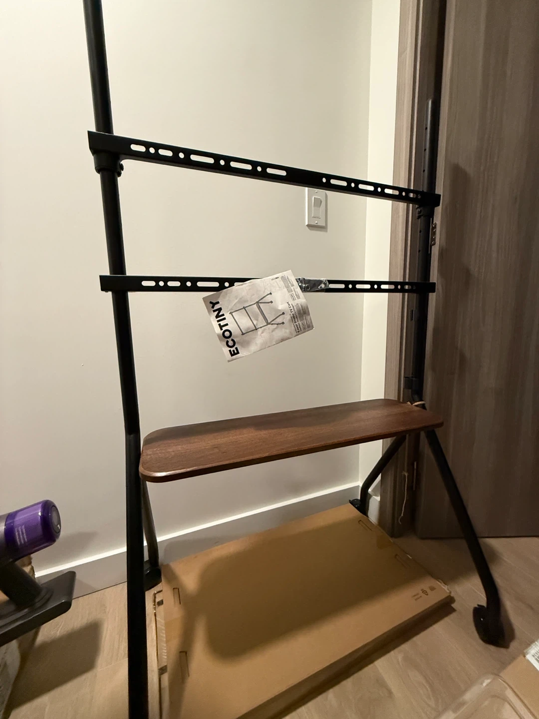 This ECOTINY TV stand features a black metal frame and a stylish wood shelf. It's designed to hold a television. Assembly instructions are included.