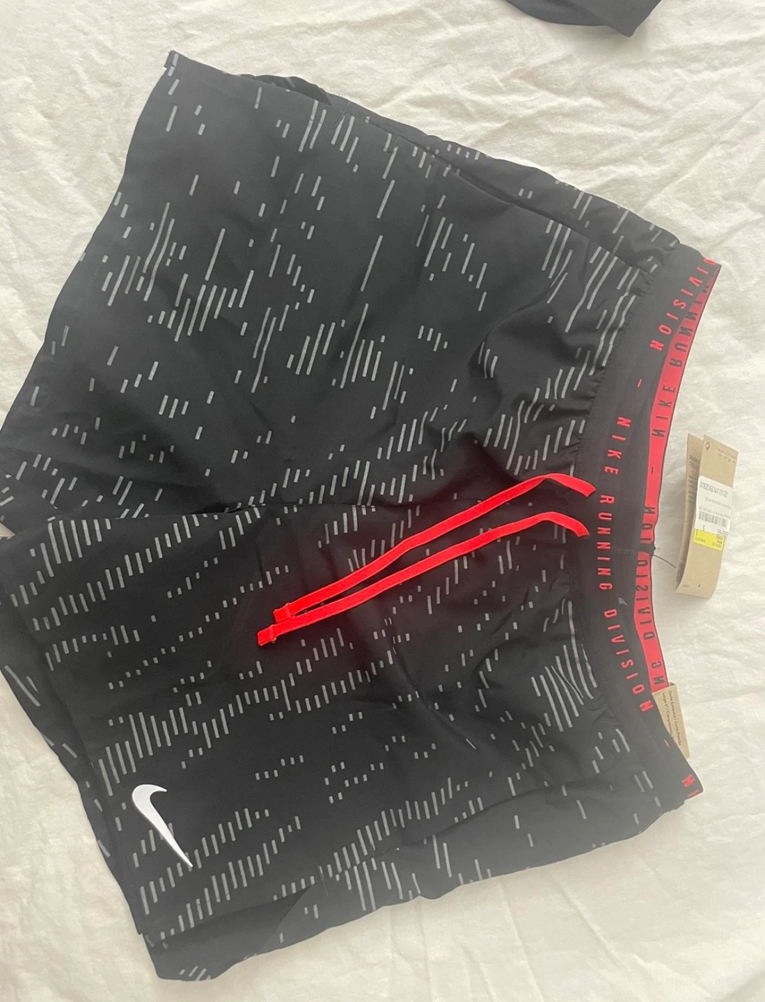 Black running shorts with reflective dash pattern and red drawstring. Features Nike Running Division waistband and a zippered back pocket. Standard fit, 5" inseam.