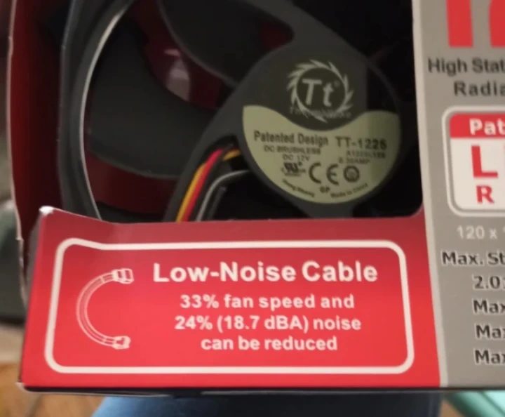 Dimensions are 120 x 120 x 25 mm. It has a low-noise cable for reduced fan speed and noise.