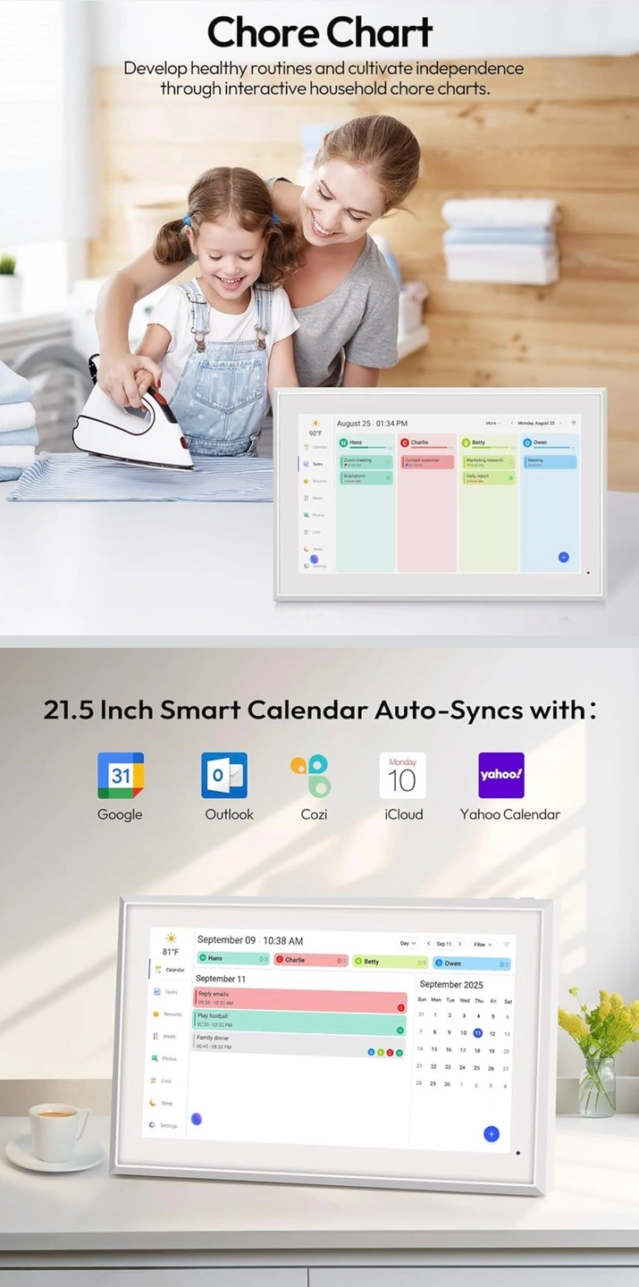 [Easy Setup and Auto-Sync] Enjoy a user-friendly design, and our smart wall planner allows for quick setup - plug in, connect to Wi-Fi, and link your calendar to the Mobile App. Once synced, it seamlessly integrates multiple personal calendars. Compatible with iCloud Calendar, Google Calendar, Outlook Calendar, Cozi, and Yahoo, enabling seamless management and sharing of your schedule across all your devices.