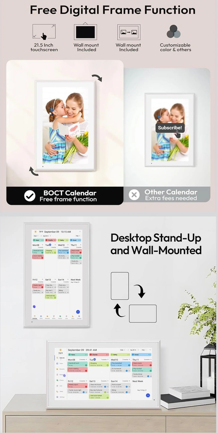 [Manage from Anywhere] Stay connected with the powerful eCalendar App. Access and manage your calendar on the go, with free features like a photo frame, chore chart, dinner plan, grocery list, and more. All these are free functions.