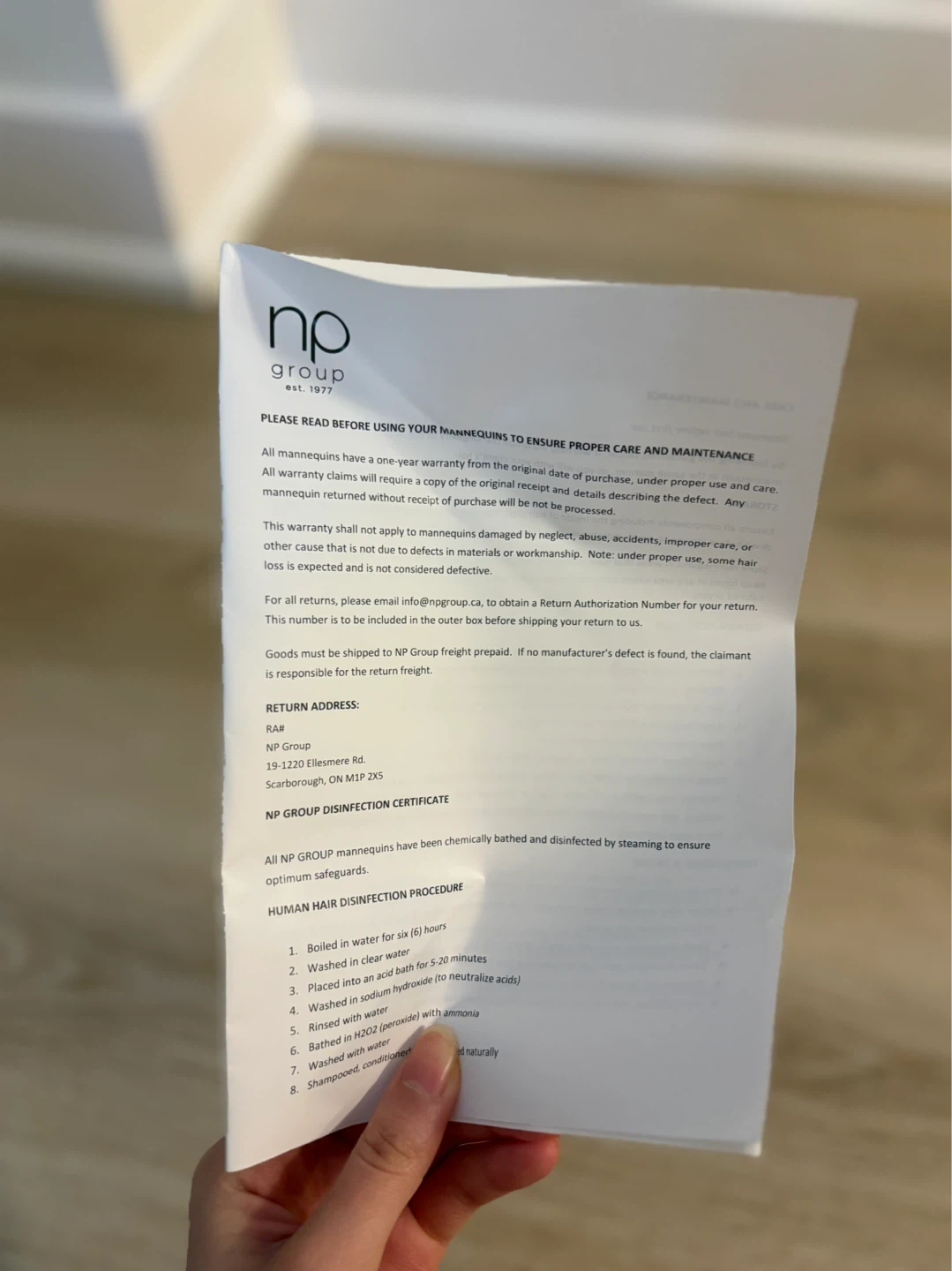 This NP Group "Emma" mannequin head features human hair. It's been chemically bathed and disinfected by steaming. Comes with original box and paperwork.