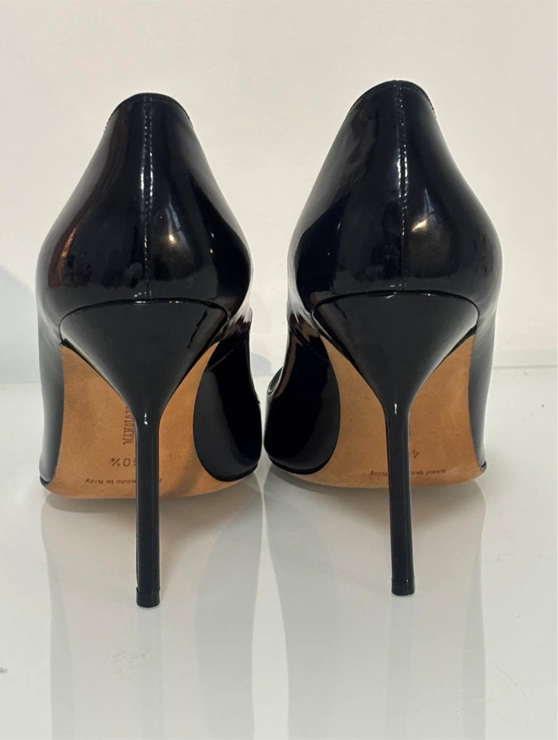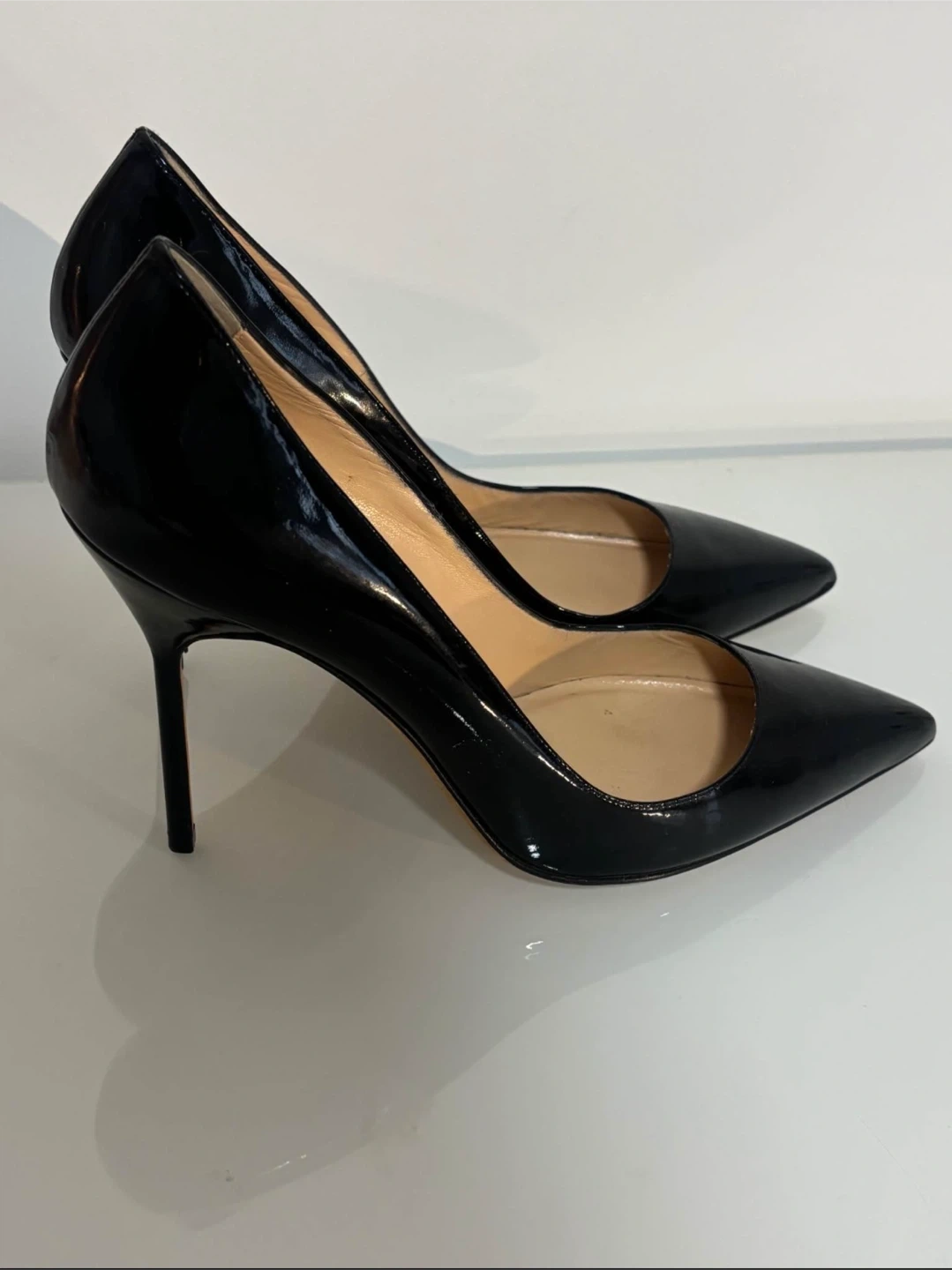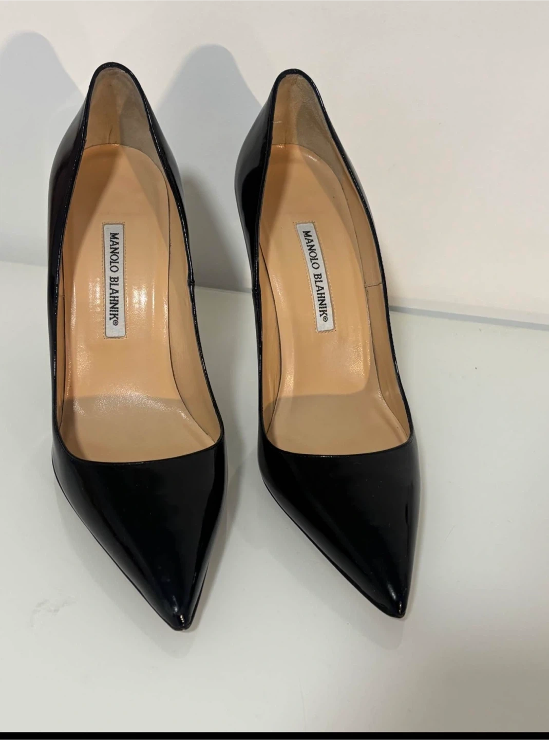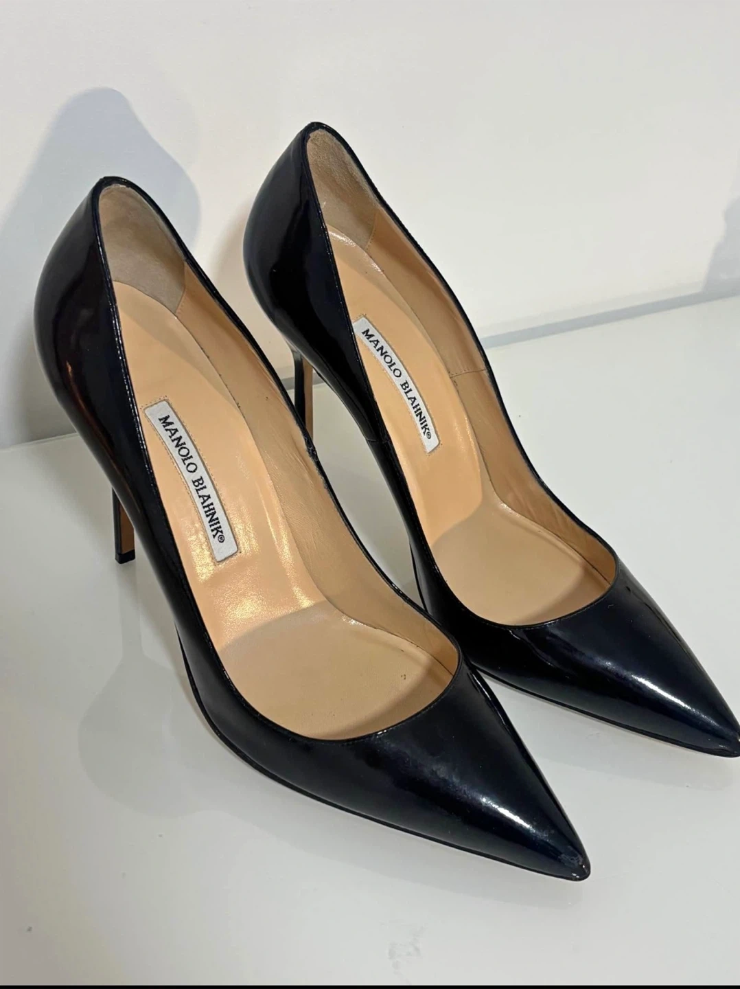 Classic Manolo Blahnik black patent leather pumps. Pointed toe, high heels. Great for dressing up any outfit.