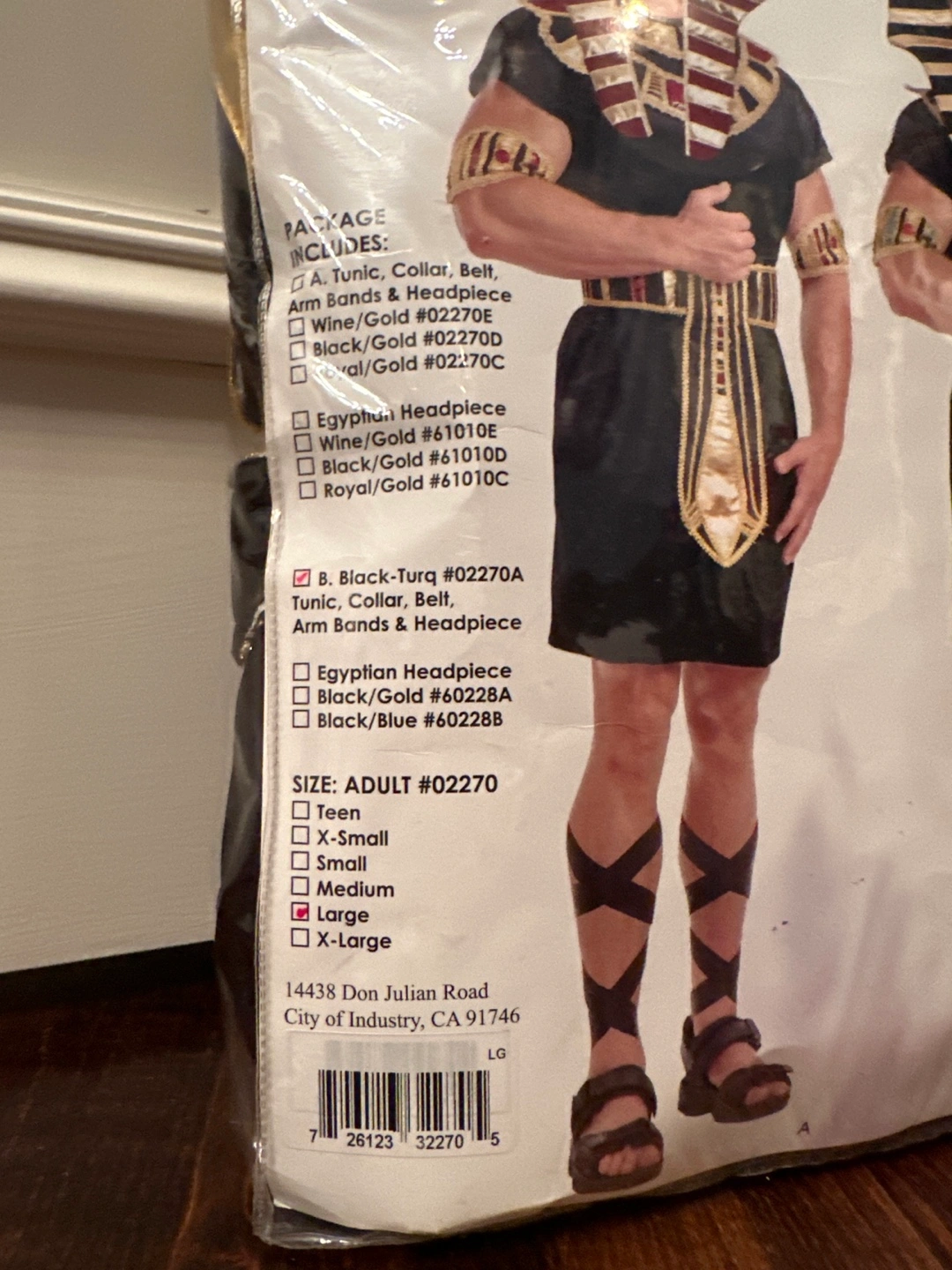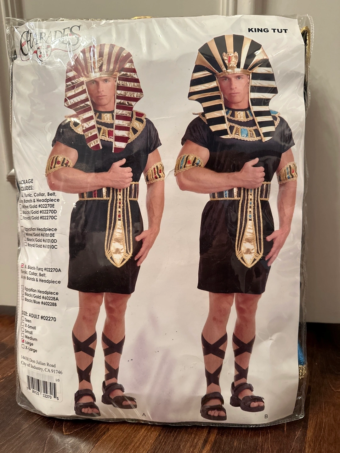 21Adult King Tut costume, size large. Includes tunic, collar, belt, arm bands, and headpiece.