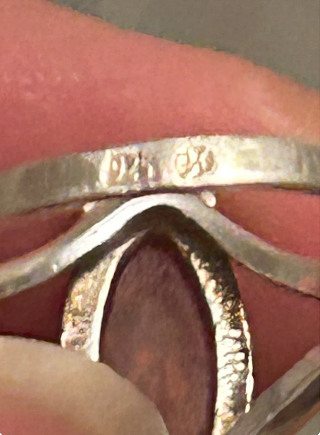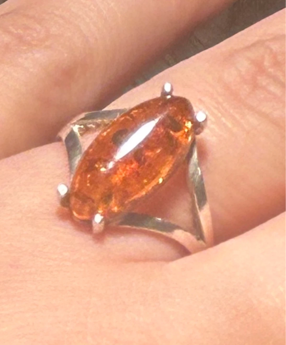 This ring features a marquise-cut amber stone set in sterling silver. The band is simple and modern. It's a lovely piece for everyday wear!