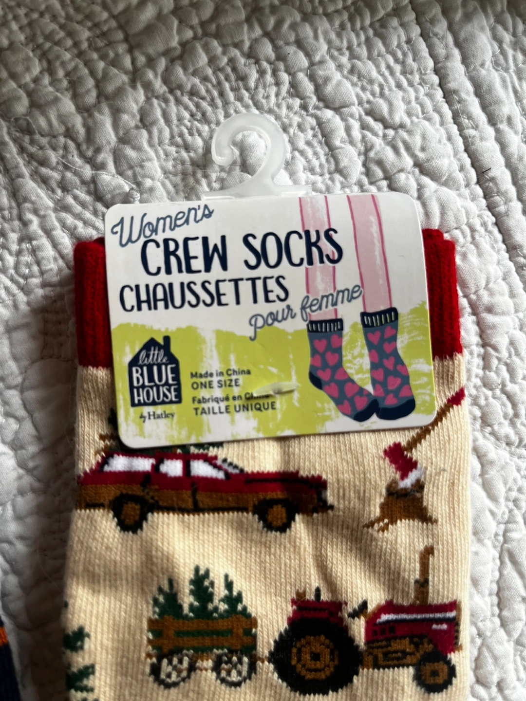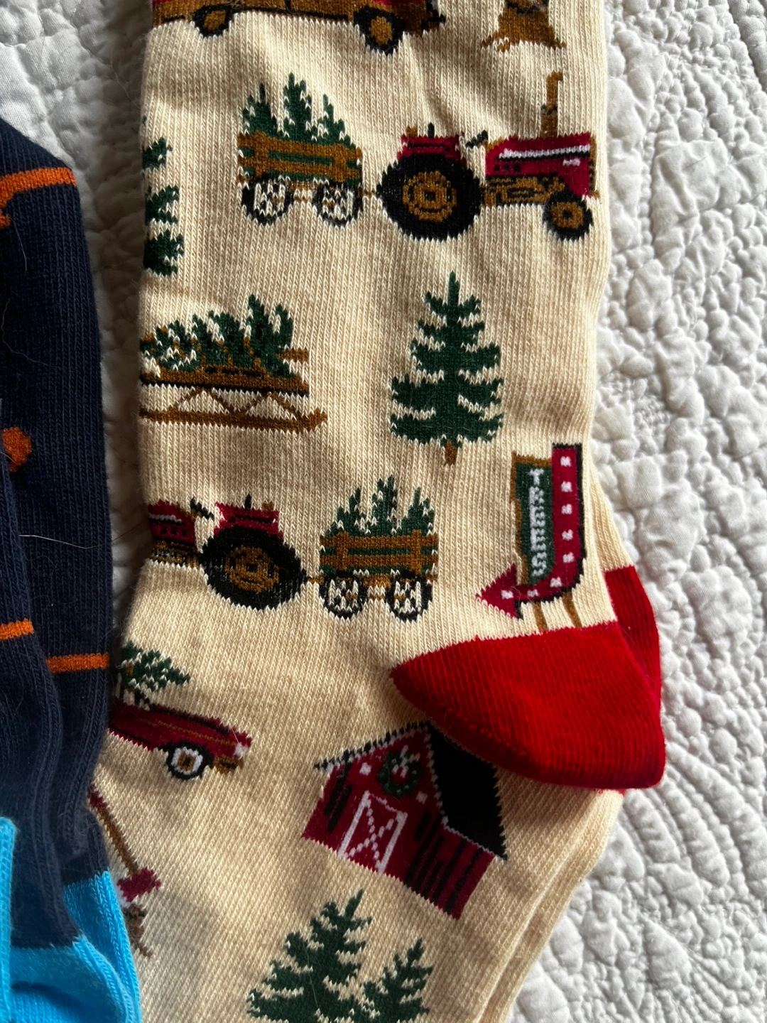 The other pair (Women’s) shows a Christmas tree farm design on a cream background with a red cuff. One size fits most.