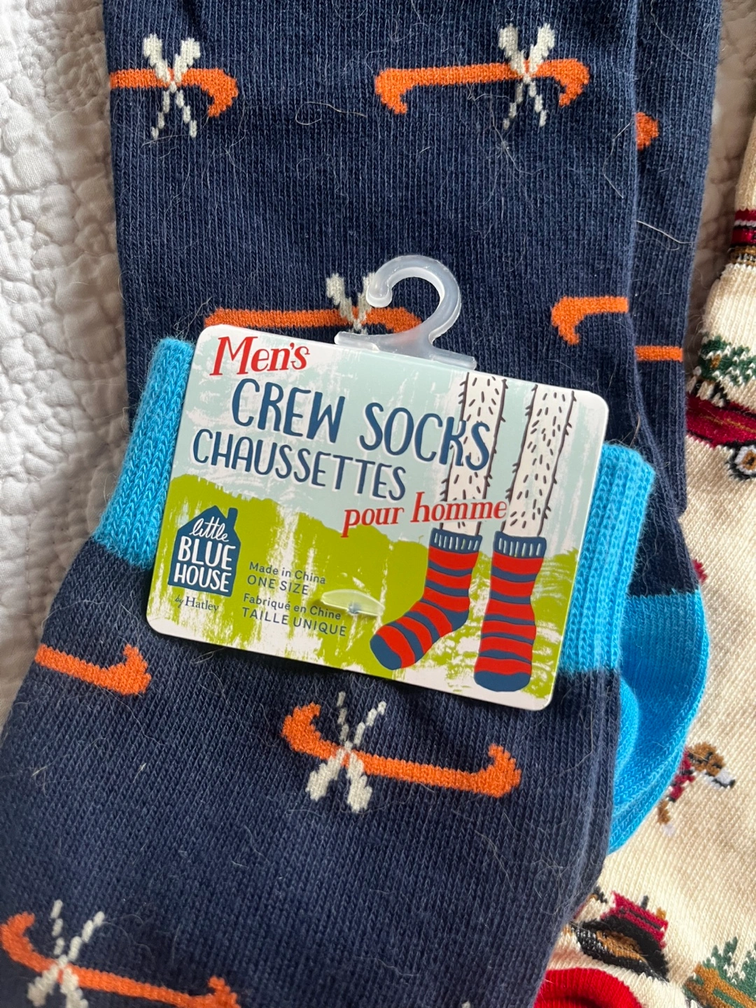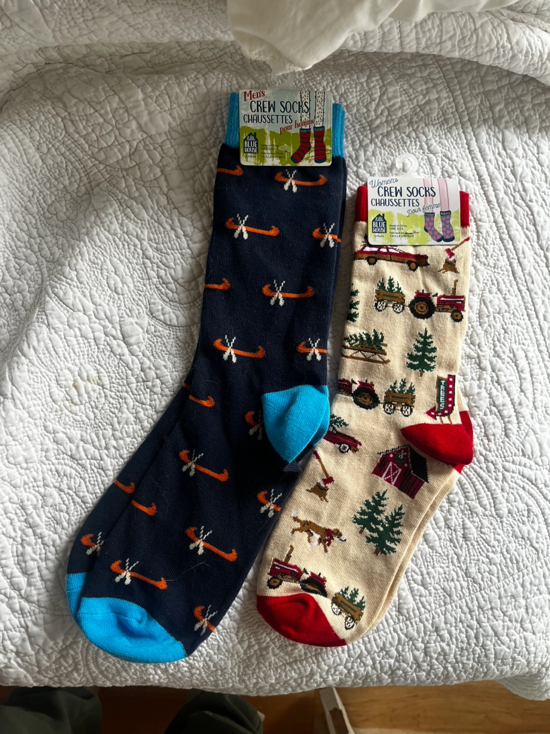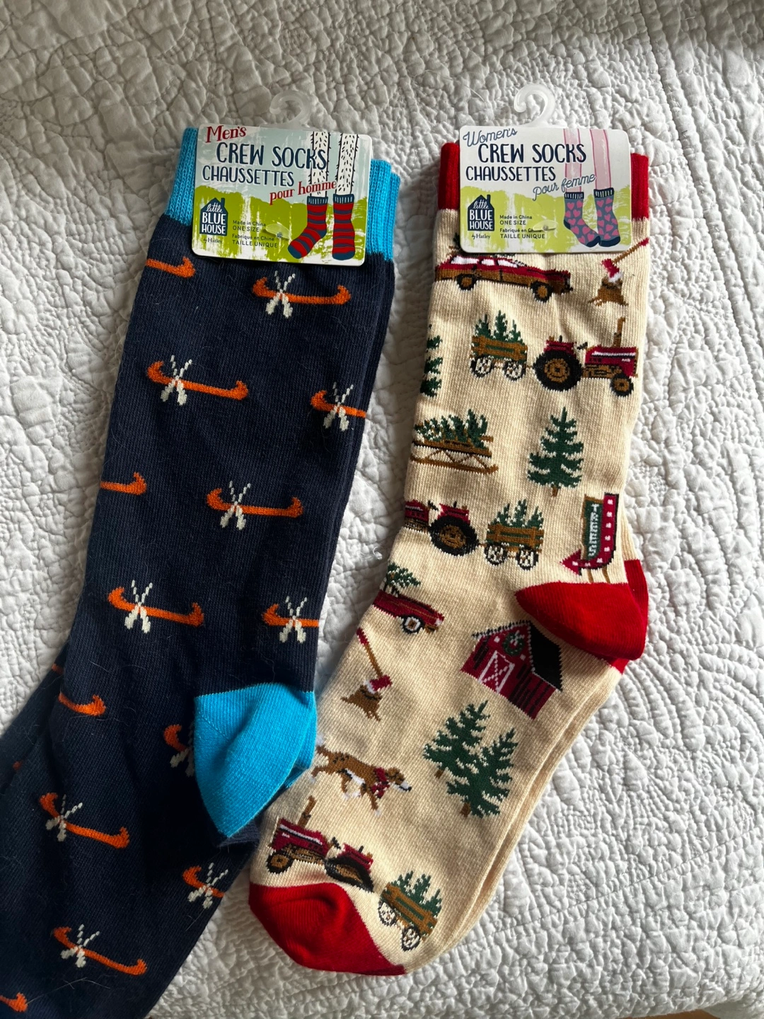 One pair (Men’s) features a canoe pattern on a navy background with a teal cuff.
