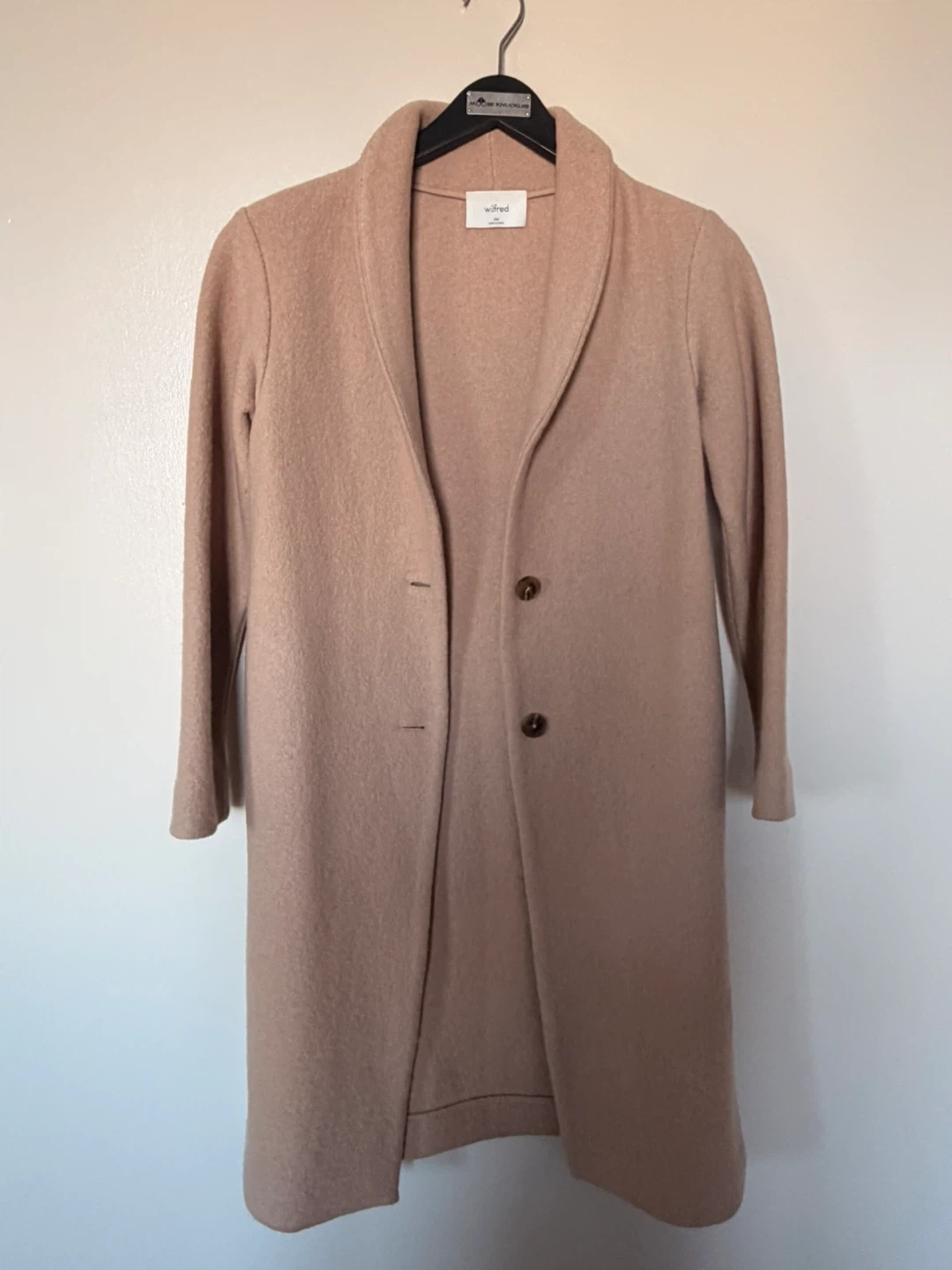 A Wilfred Merinos wool blend coat in a neutral beige colour.