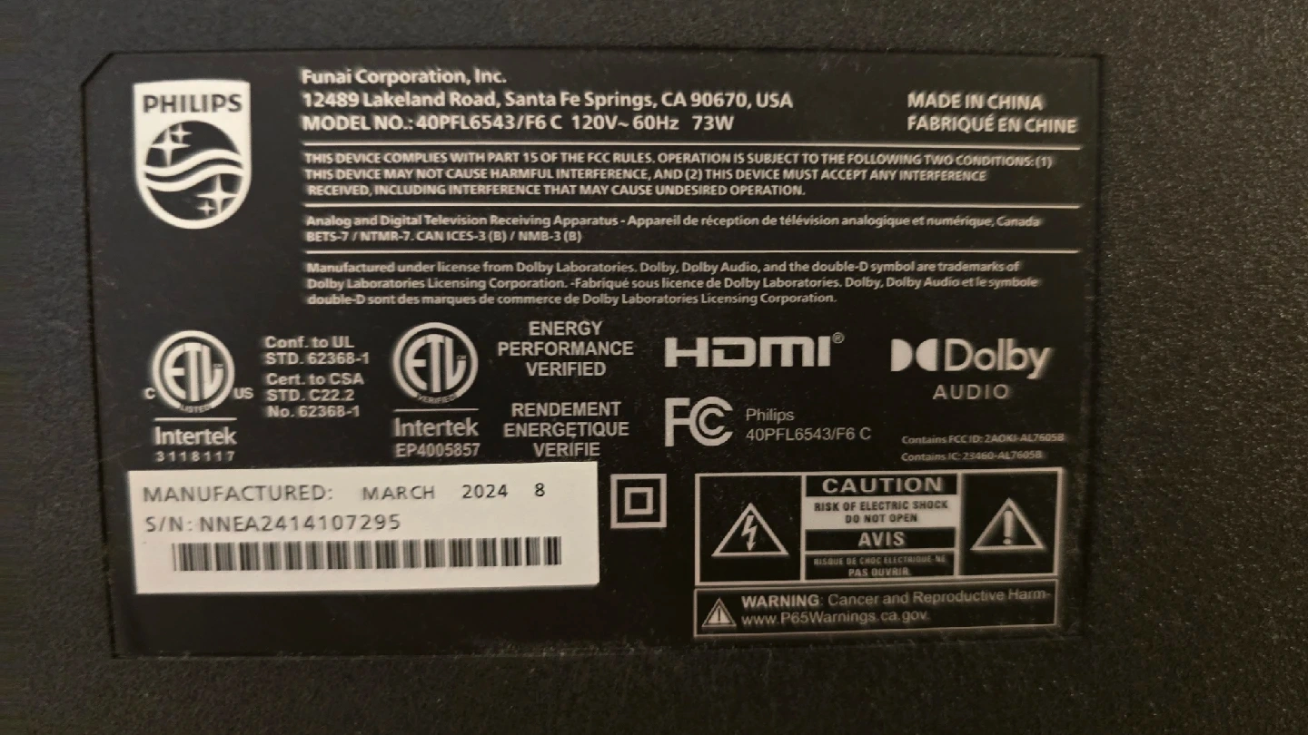 23Selling a Philips Roku TV, model 40PFL6543/F6. It's in great condition and ready to stream all your favourite shows! It uses 120V ~ 60Hz 73W. Manufactured in March 2024