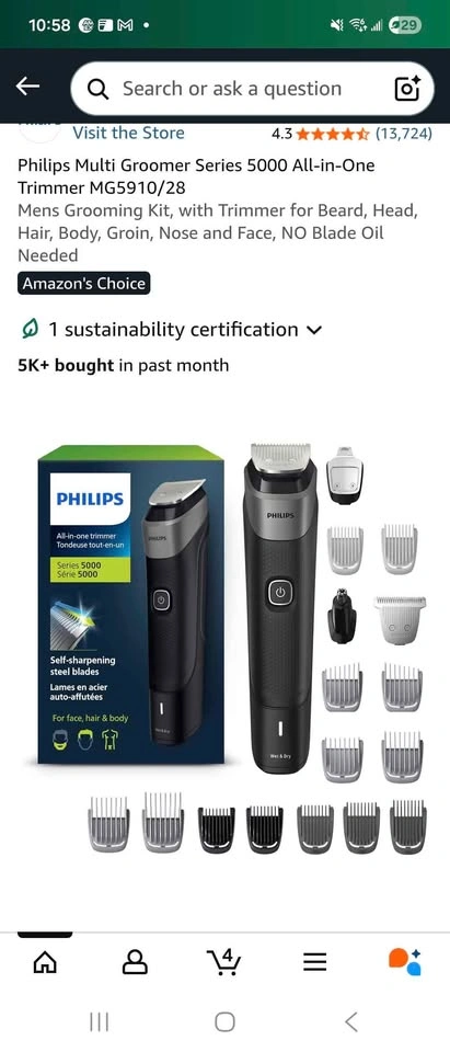 65Hey everyone, I'm selling my Philips 5000 trimmer and it's ready for a new home! This thing is a total game-changer for any grooming routine. It's super easy to use and has different attachments for whatever style you're going for. Let me know if you're interested!