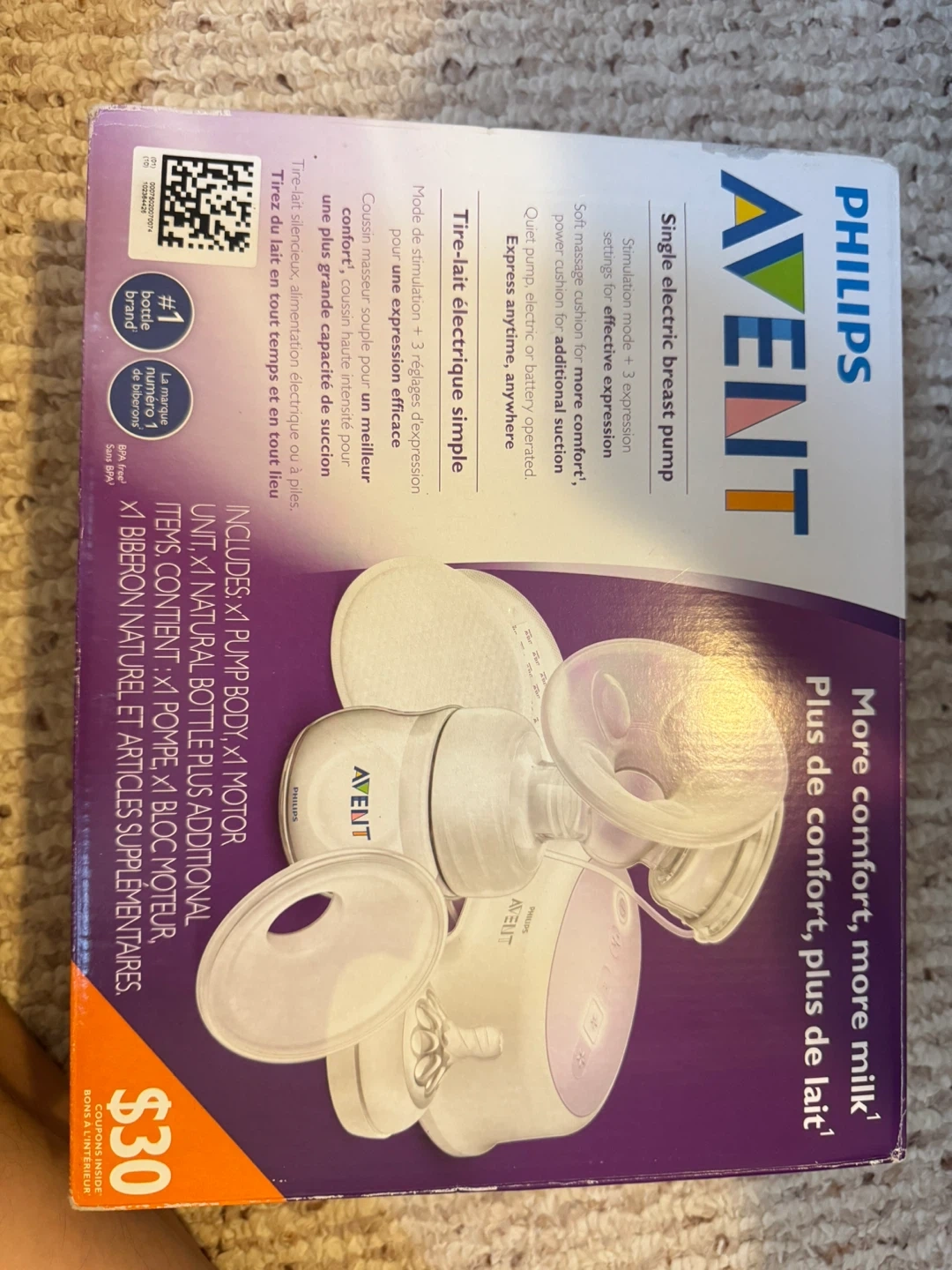 298Selling a Philips Avent single electric breast pump! It has a stimulation mode and 3 expression settings for effective expression. It also has a soft massage cushion for more comfort. Includes the pump body, motor unit, and one natural bottle plus additional items. Coupons inside the box!