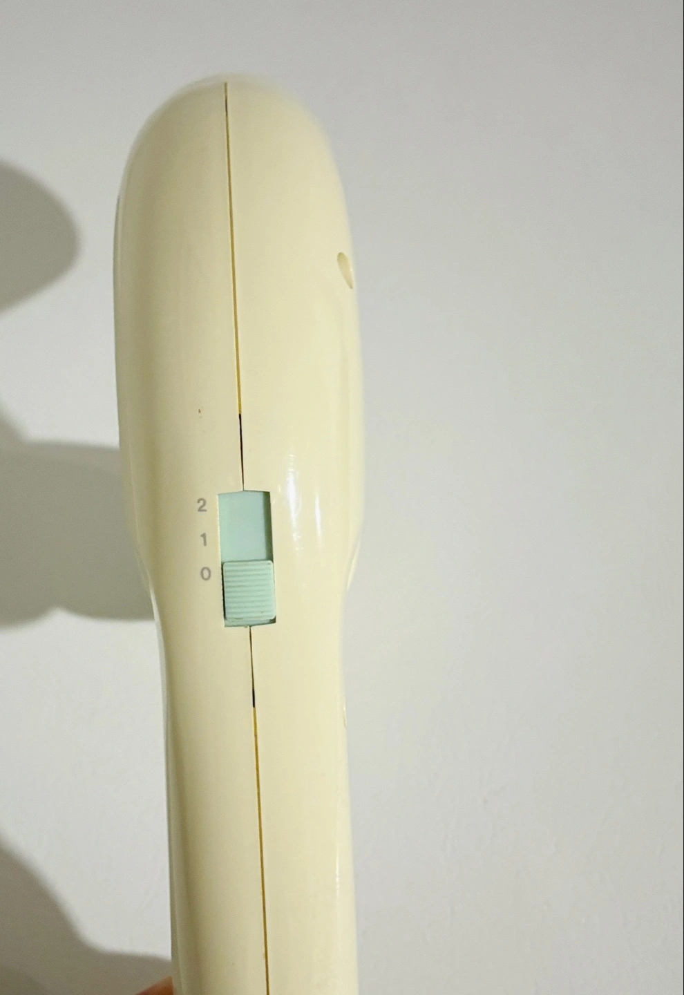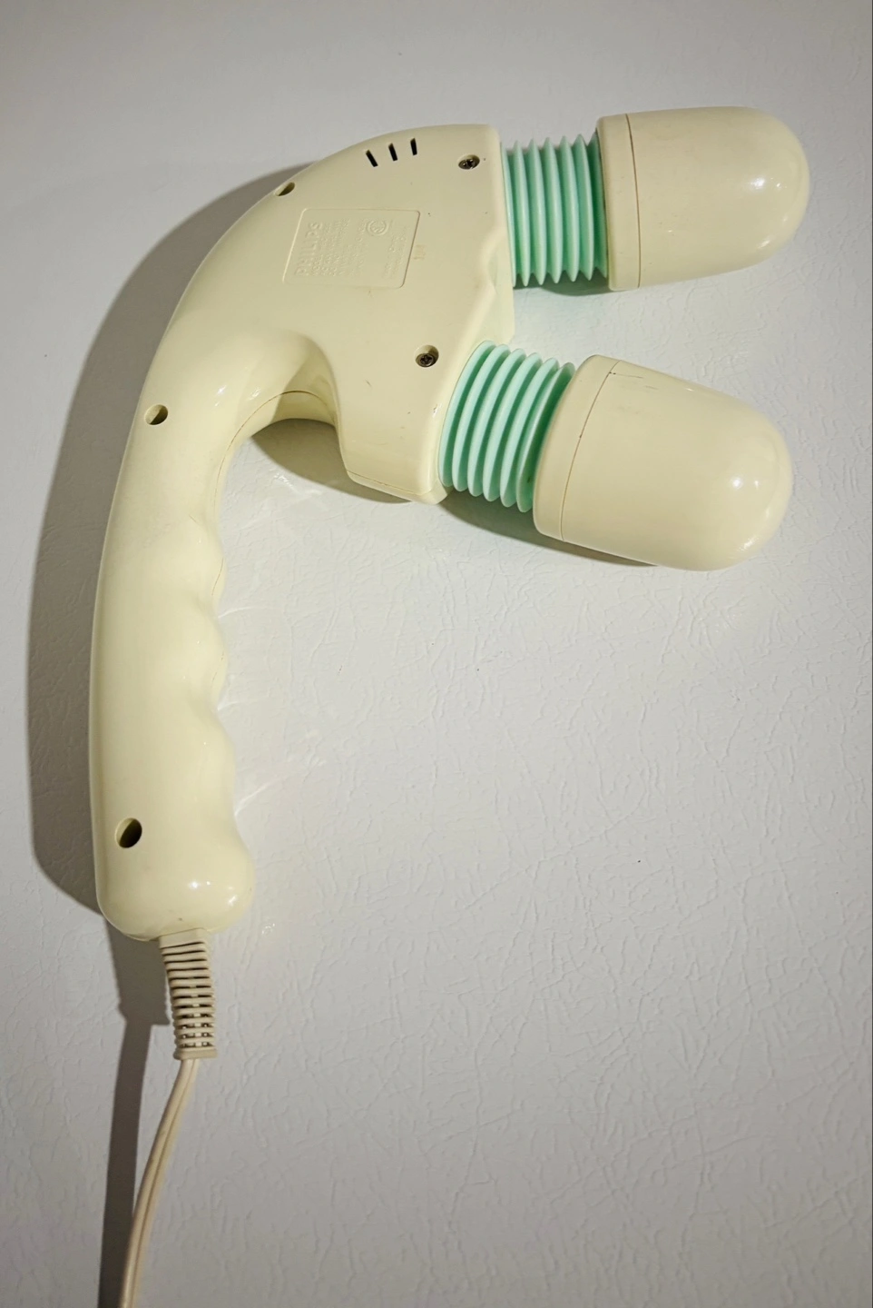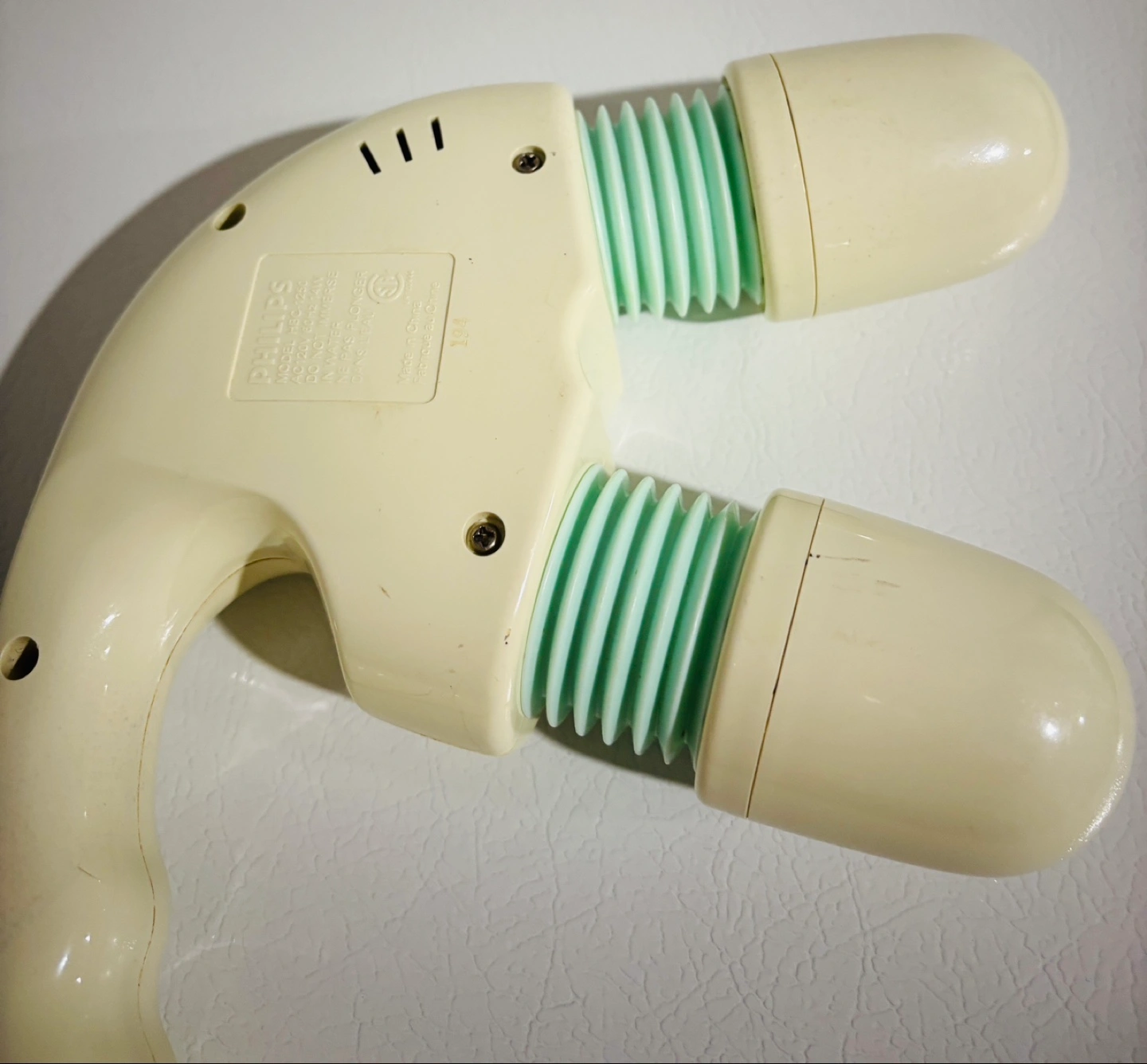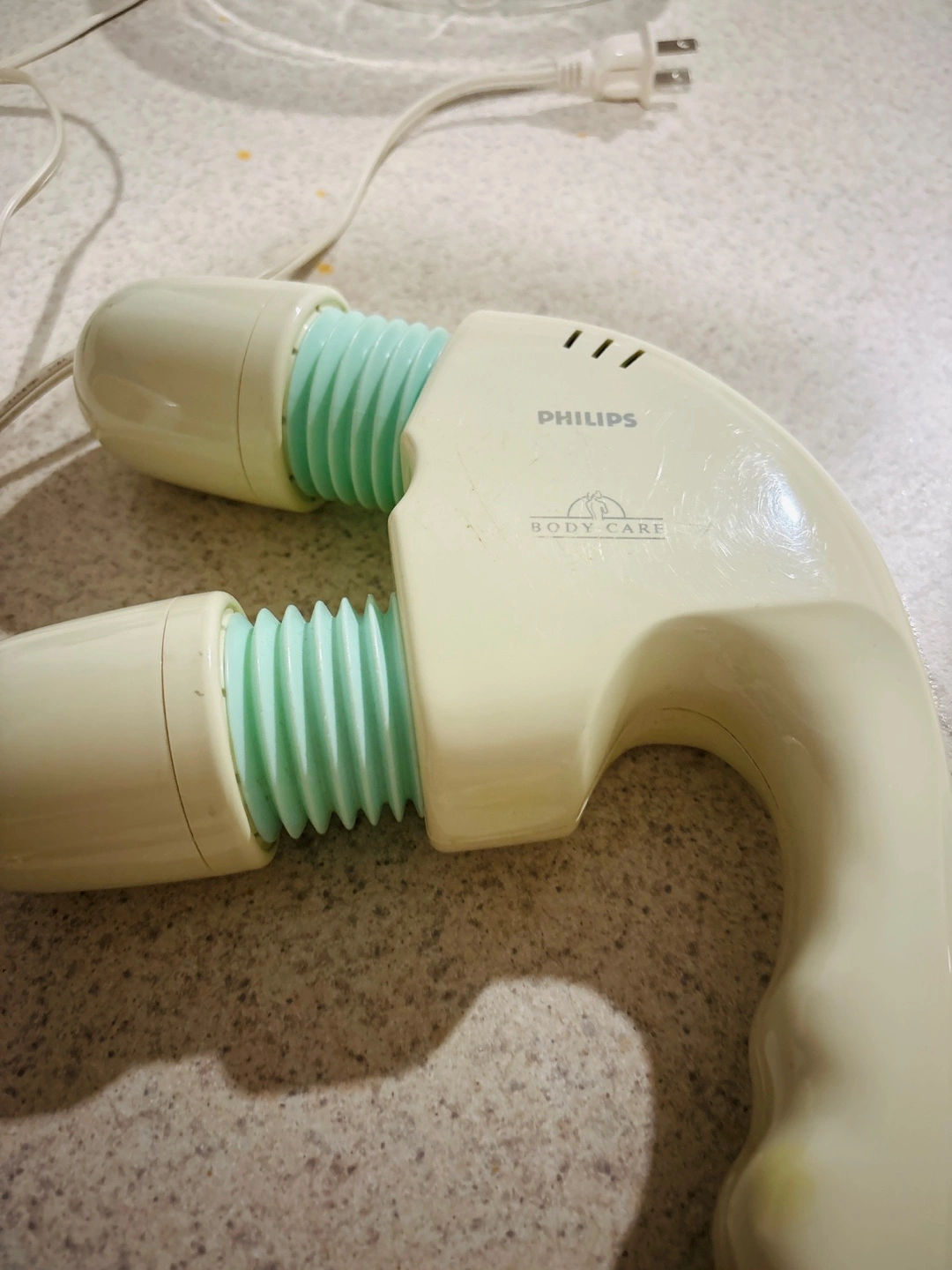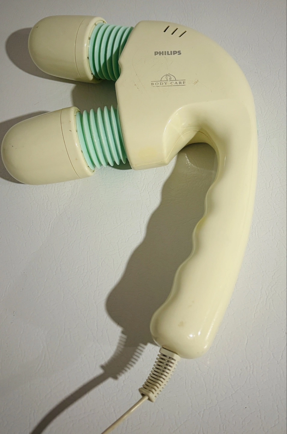Vintage Philips Body Care massager. Off-white colour with light teal accents. Features two massage heads. Cord included. Two speed settings.