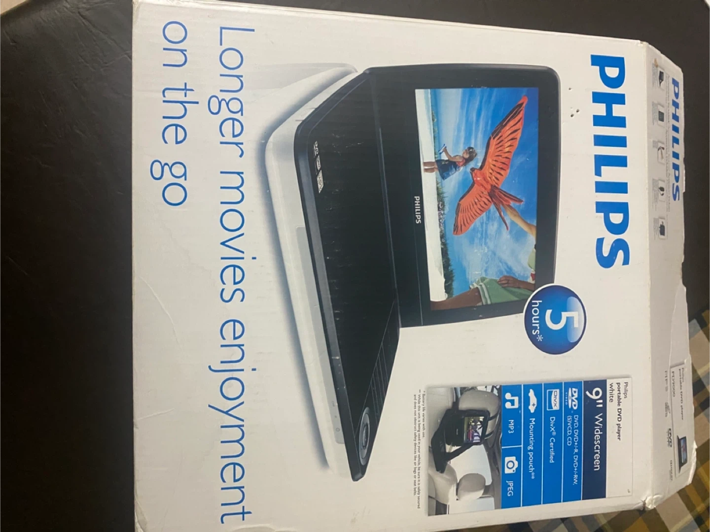 Selling a Philips portable DVD player! It comes with a 9-inch widescreen for enjoying movies on the go. The box is included, and it's in good condition. Perfect for road trips or keeping the kids entertained!