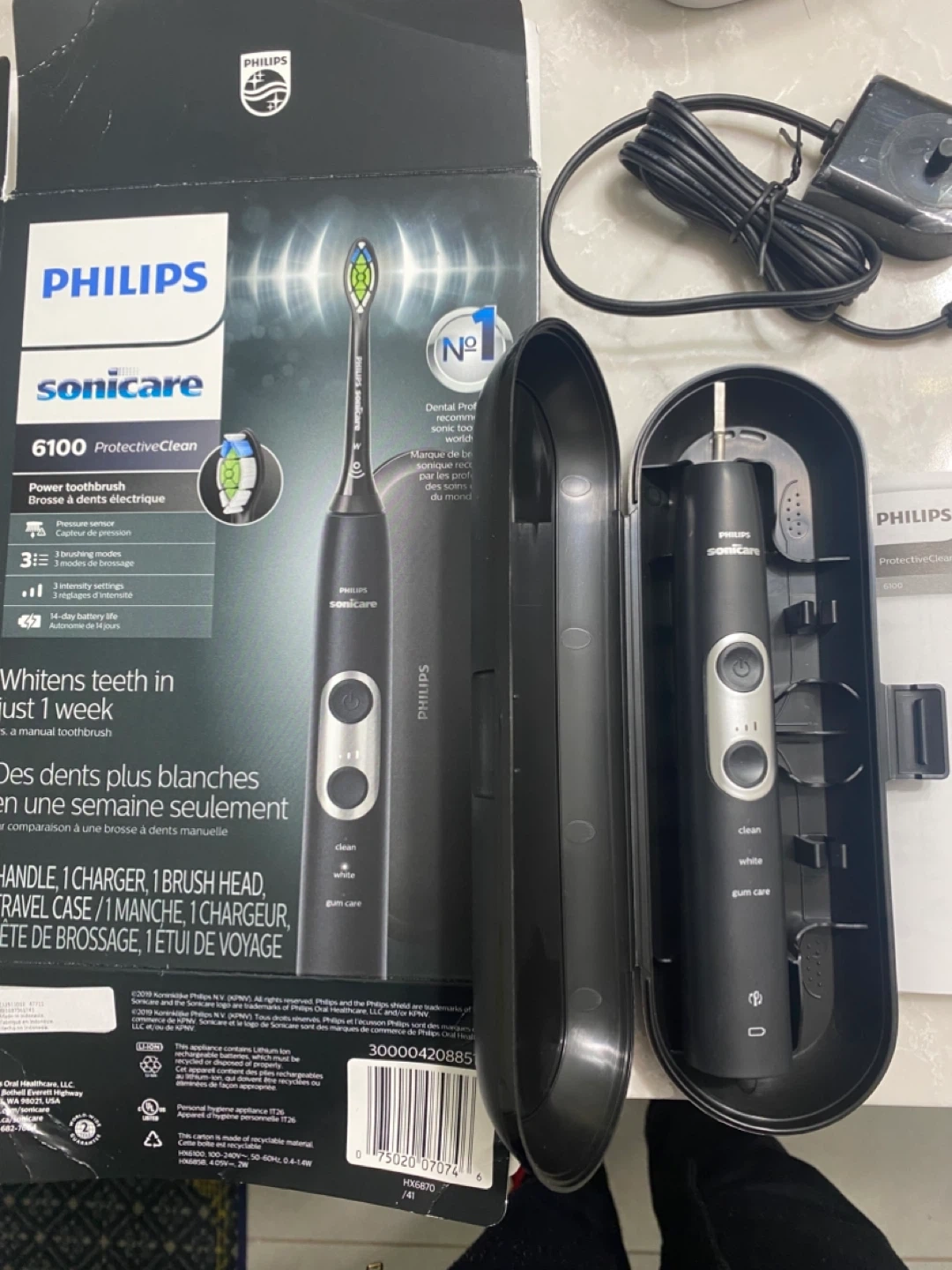 Philips Sonicare 6100 ProtectiveClean power toothbrush for sale! It features a pressure sensor, 3 brushing modes, and 3 intensity settings. You'll also get a handle, charger, brush head, and a travel case. Whitens teeth in just one week! Got it two months ago. Just used few times. My family just gave his electric toothbrush to me. So I don’t need extra one. Doesn’t have toothbrush head. Price can be Negotiable.