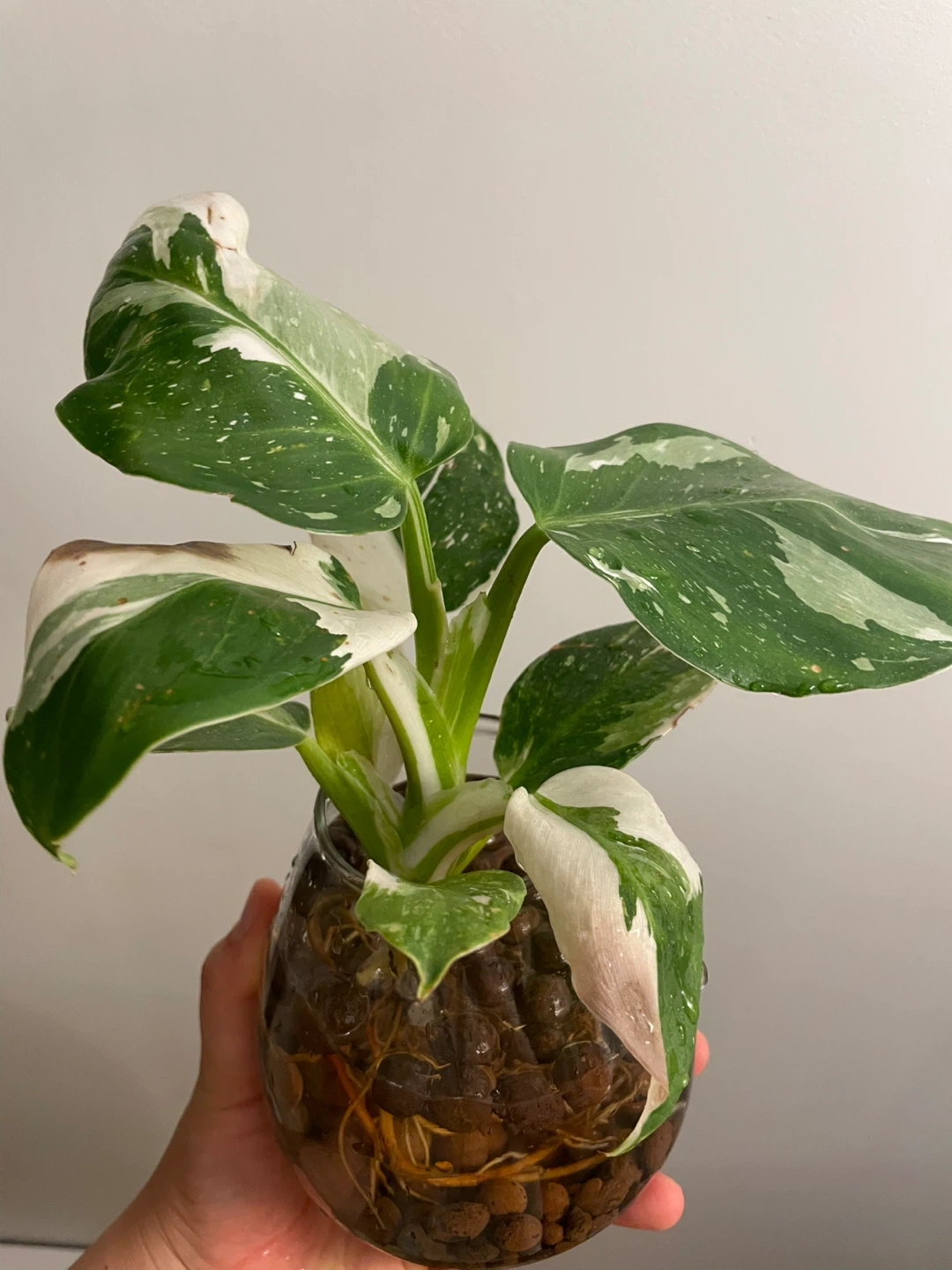 Selling a beautiful Philodendron White Wizard plant! It has lovely green and white variegated leaves and is currently potted in a glass container with pebbles. This plant would make a great addition to any indoor space