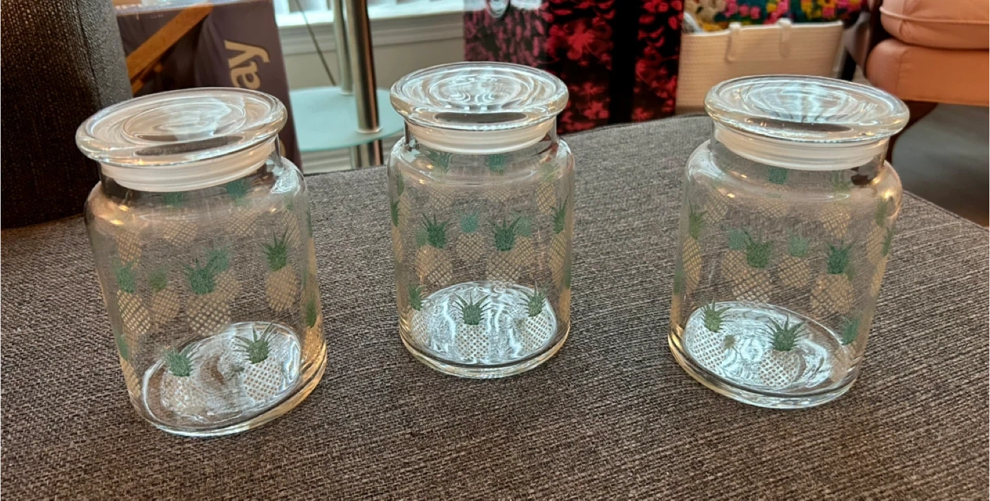 Set of three clear glass storage jars featuring a green pineapple design. These jars come with clear glass lids, perfect for kitchen counter or pantry/bathroom organization.